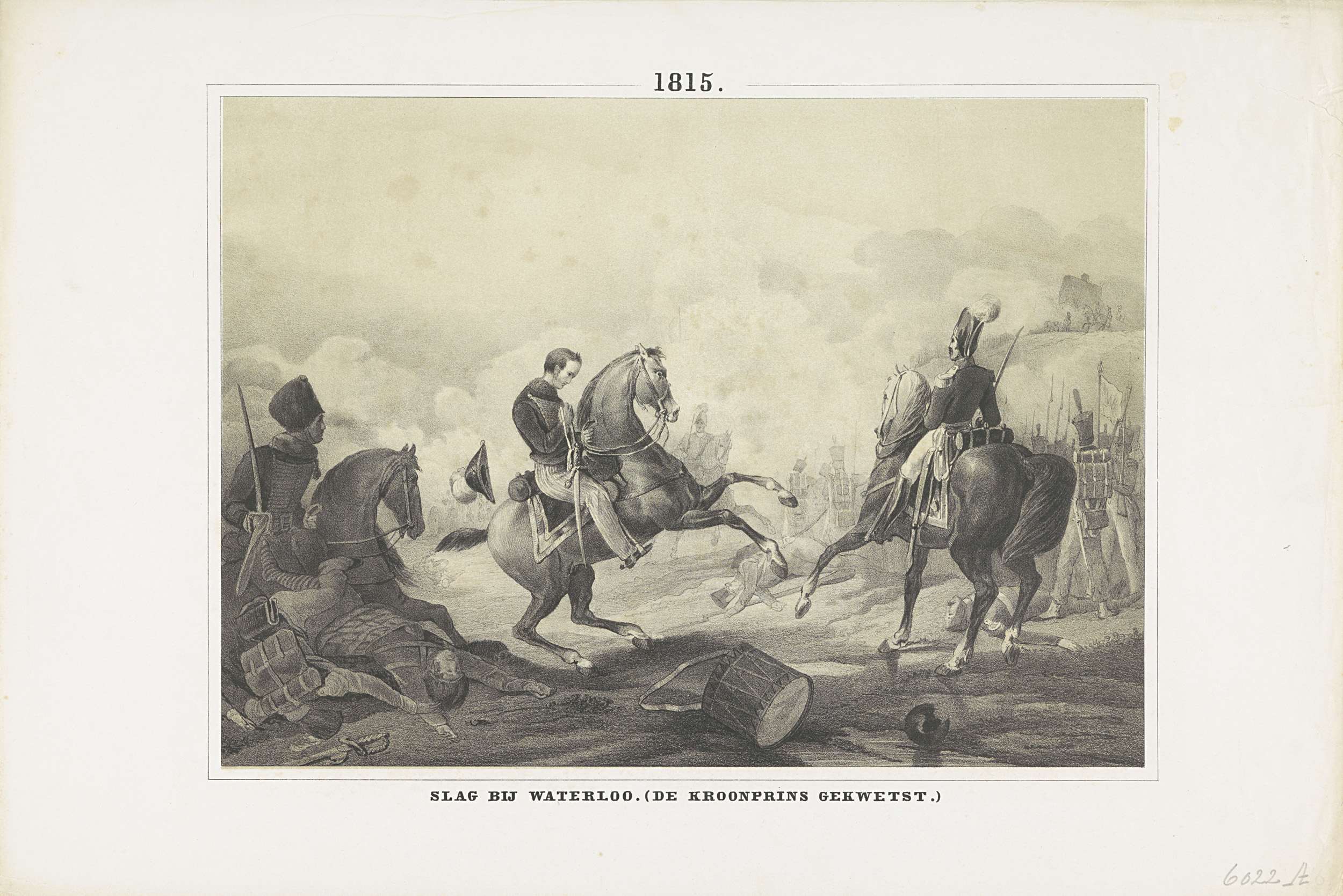 Willem Frederik George, prins van Oranje, raakt tijdens de slag bij Waterloo op 18 juni 1815 gewond aan de linkerschouder. Op de achtergrond zware gevechten.