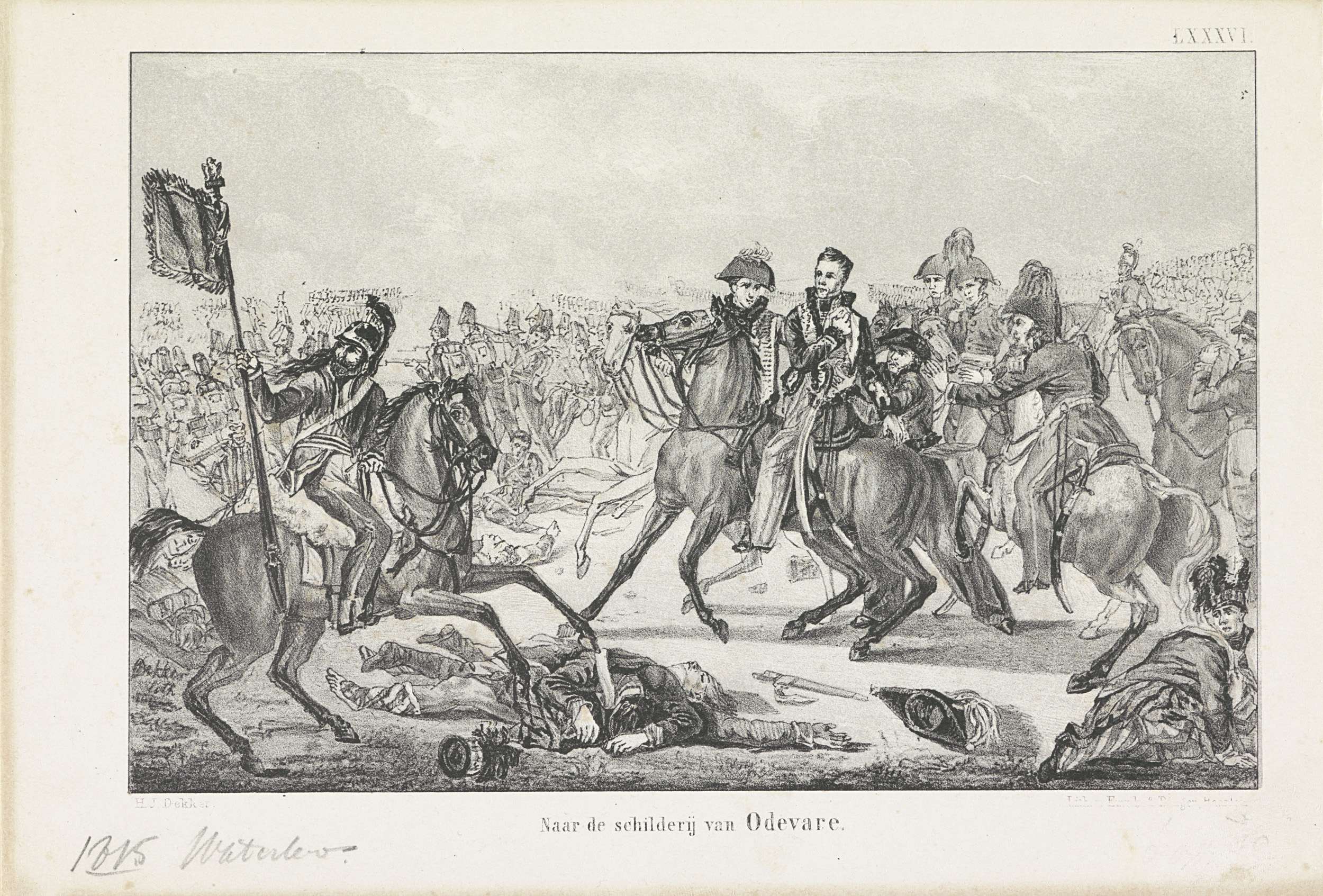 Willem Frederik George, prins van Oranje, raakt tijdens de slag bij Waterloo op 18 juni 1815 gewond aan de linkerschouder. De prins omringd door officieren te paard, links een vaandeldrager. Op de achtergrond zware gevechten. Gemerkt rechtsboven: LXXXVI.