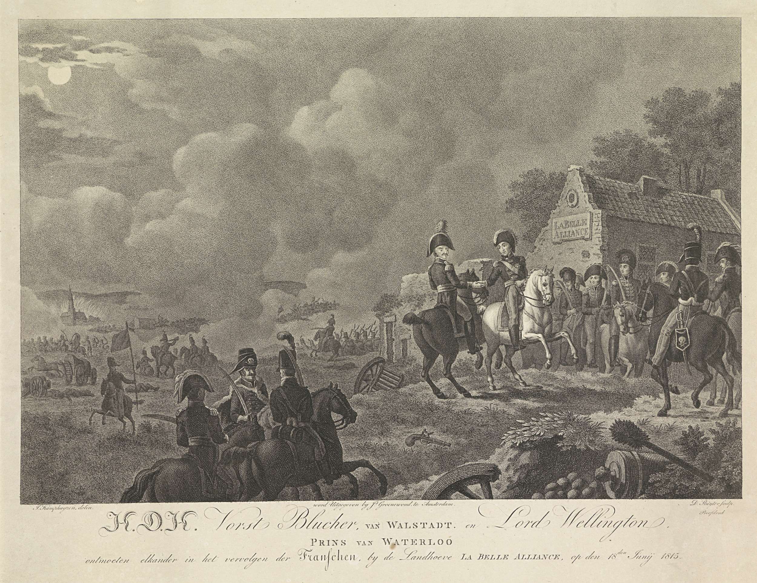 Ontmoeting tussen de opperbevelhebbers de hertog van Wellington en de vorst Blücher, 's avonds na de slag bij Waterloo op 18 juni 1815, voor de boerderij La Belle Alliance.