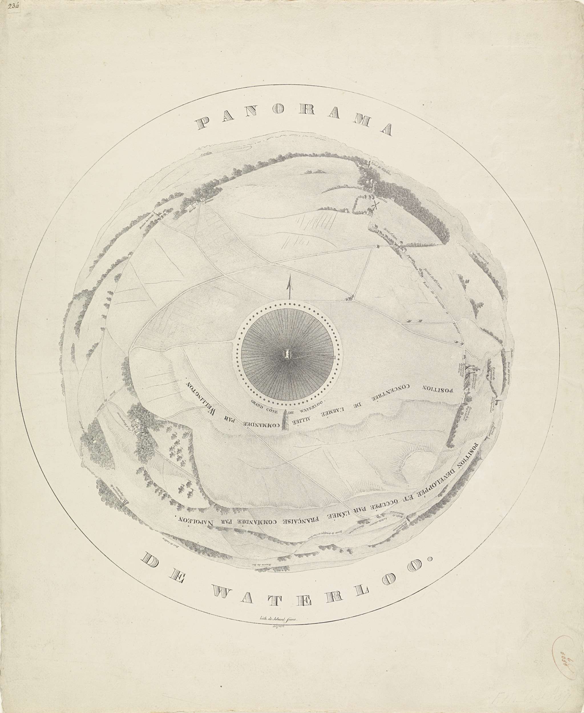 Rond panorama van het terrein waar de slag bij Waterloo is uitgevochten op 18 juni 1815. Glooiend landschap waarop de posities van de legers onder Wellington en Napoleon, bossen, boerderijen en kerken zijn aangegeven, in perspectief gezien vanaf de Leeuw van Waterloo, het monument voor de veldslag.