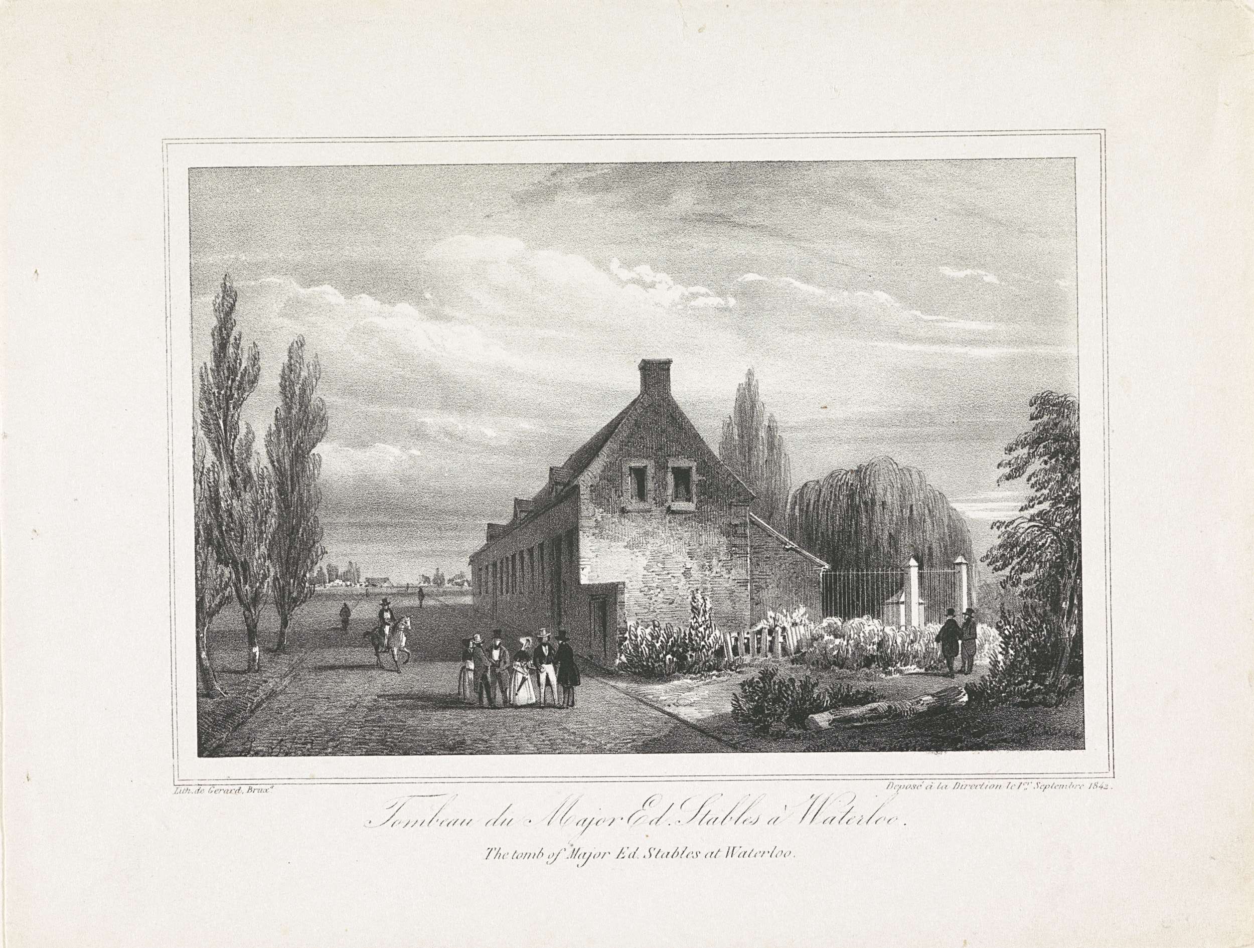 Gezicht in een straat in Waterloo met het graf van de Britse militair Edward Stables. Stables sneuvelde tijds de slag. Onderdeel van een serie van twaalf platen (aangevuld tot veertien) met gezichten uit ca. 1840 van de omgeving waar de slag bij Waterloo plaatsvond op 18 juni 1815.