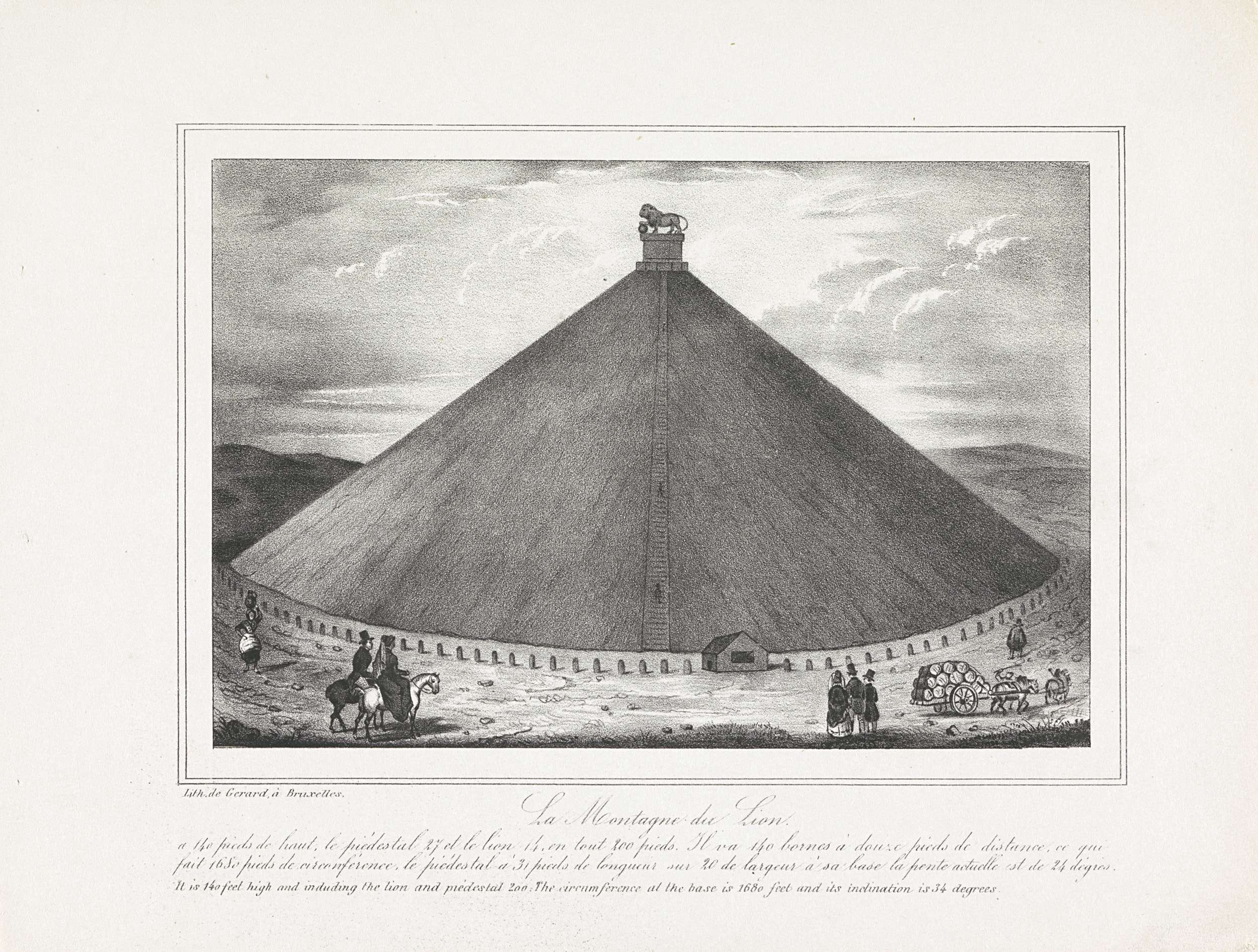Het monument genaamd de Leeuw van Waterloo, opgericht ter nagedachtenis aan de slag. Rechts een kar met vaten. Met drieregelig onderschrift met een beschrijving van het monument in Frans en Engels. Onderdeel van een serie van twaalf platen (aangevuld tot veertien) met gezichten uit ca. 1840 van de omgeving waar de slag bij Waterloo plaatsvond ...