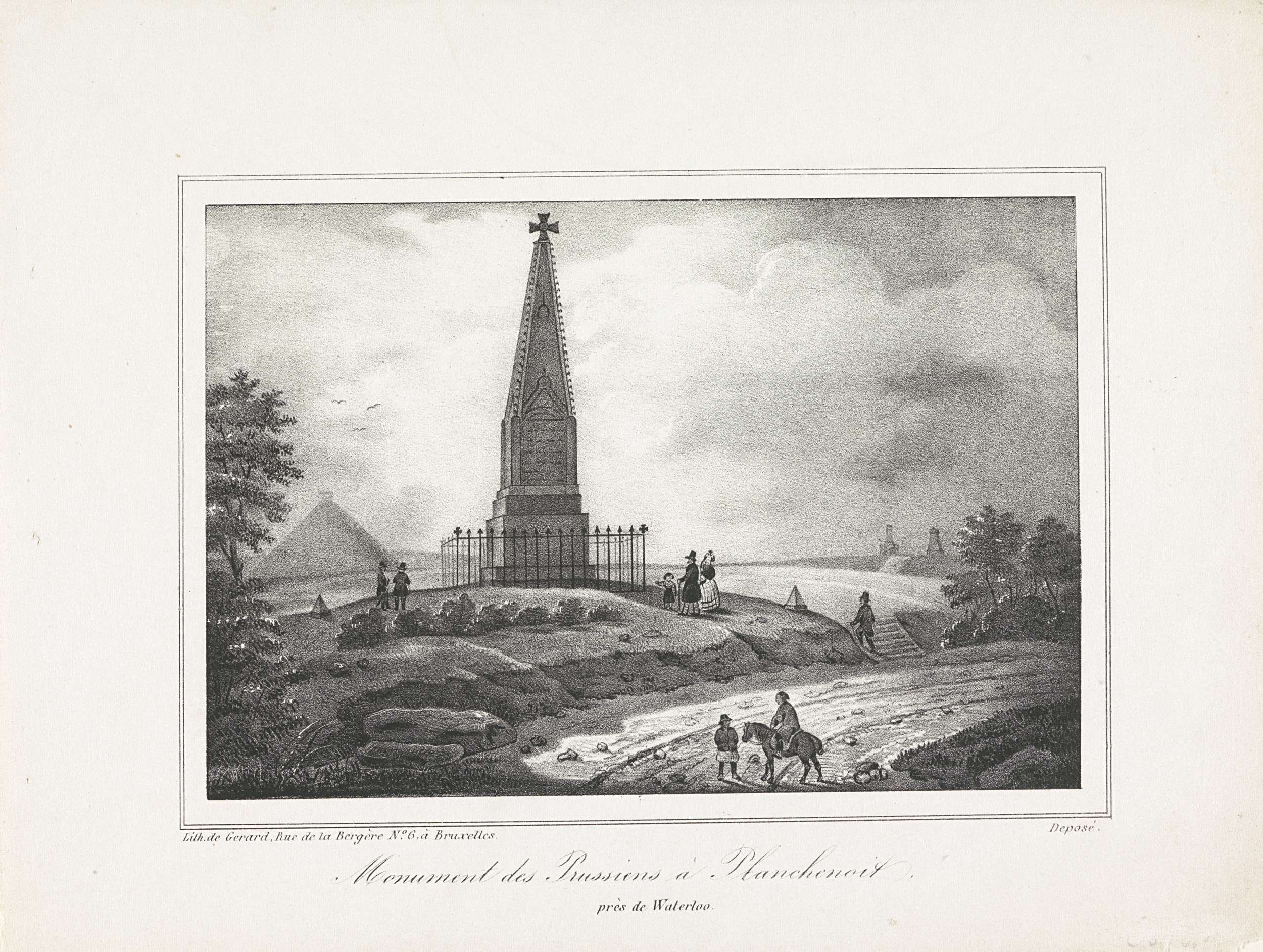 Het monument voor de gevallen Pruisische militairen, te Plancenoit nabij Waterloo. Onderdeel van een serie van twaalf platen (aangevuld tot veertien) met gezichten uit ca. 1840 van de omgeving waar de slag bij Waterloo plaatsvond op 18 juni 1815.