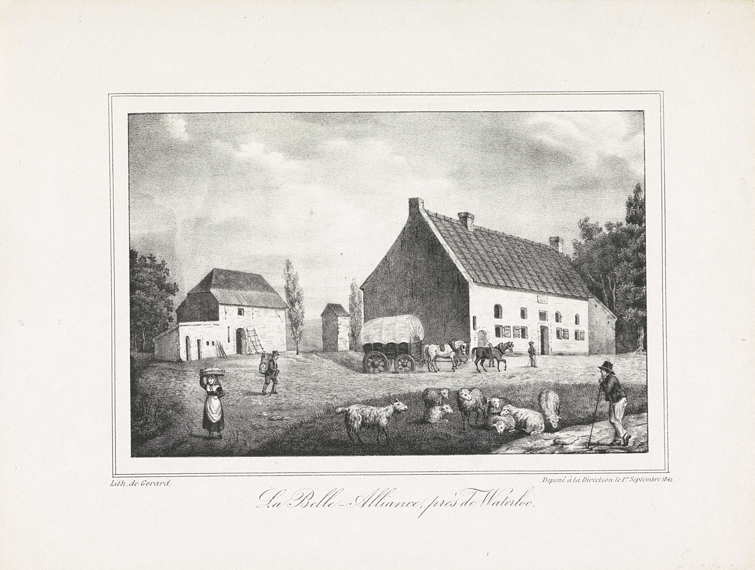 Gezicht op de boerderij genaamd La Belle Alliance, nabij Waterloo. Rechts vooraan een schapenherder. Onderdeel van een serie van twaalf platen (aangevuld tot veertien) met gezichten uit ca. 1840 van de omgeving waar de slag bij Waterloo plaatsvond op 18 juni 1815.