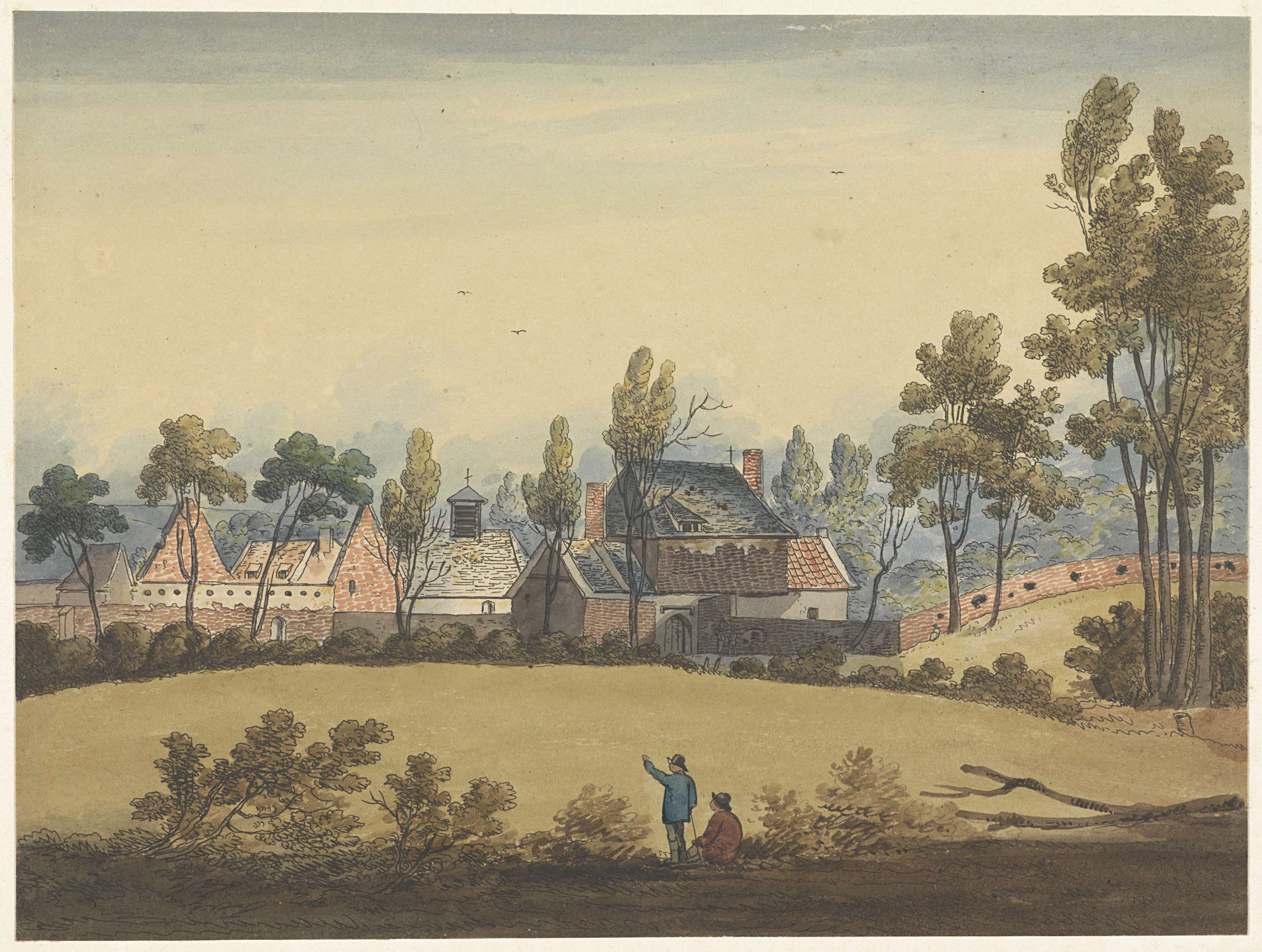 Gezicht op de ruïnes van het kasteel en de hoeve van Hougoumont, plaats van zware gevechten, nabij Waterloo. De ruïnes gezien van een afstand. Onderdeel van een serie van zeven platen met gezichten uit ca. 1820 van de omgeving waar de slag bij Waterloo plaatsvond op 18 juni 1815.