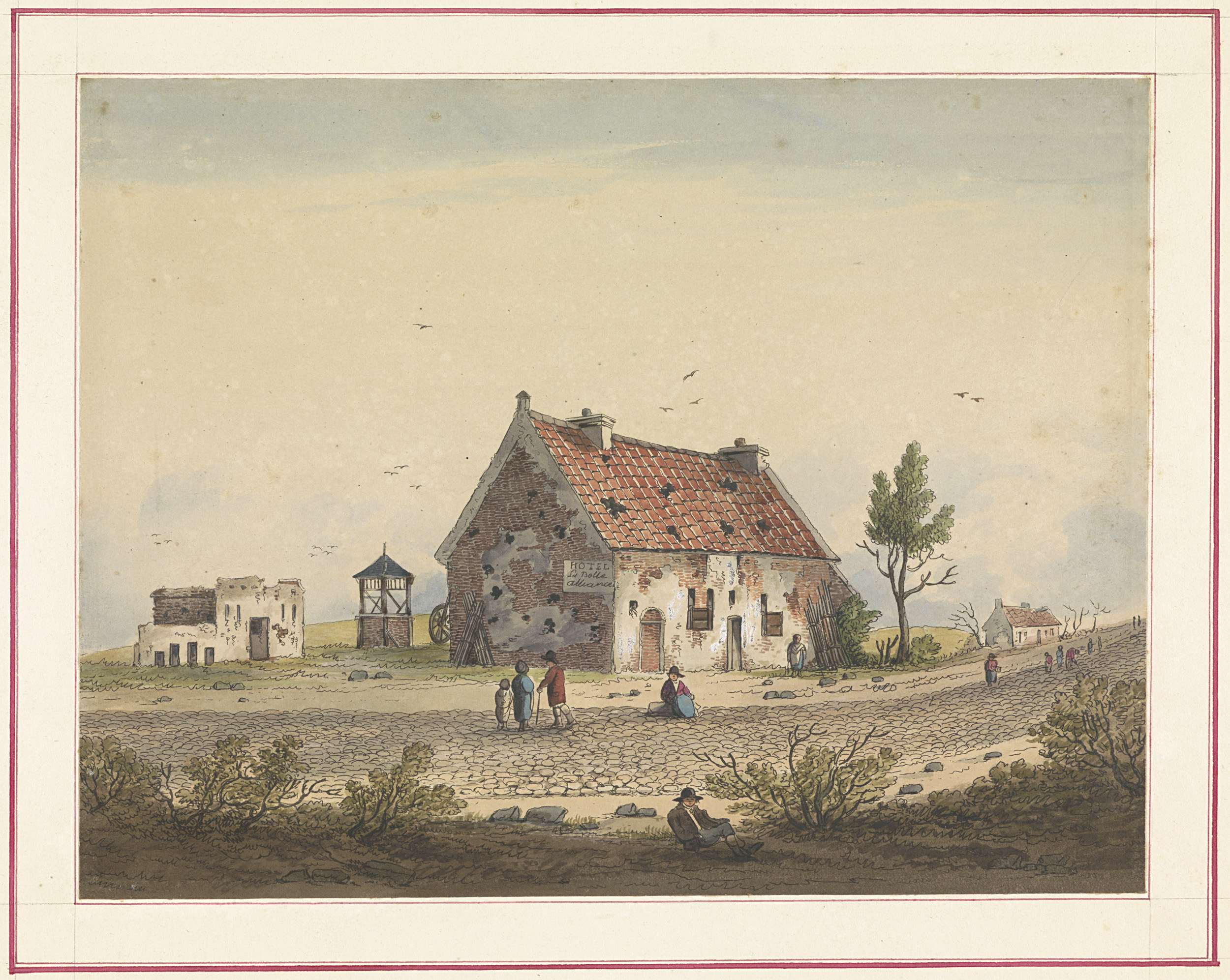 Hotel La Belle Alliance, met kogelgaten in de muren en dak. Onderdeel van een serie van zeven platen met gezichten uit ca. 1820 van de omgeving waar de slag bij Waterloo plaatsvond op 18 juni 1815.