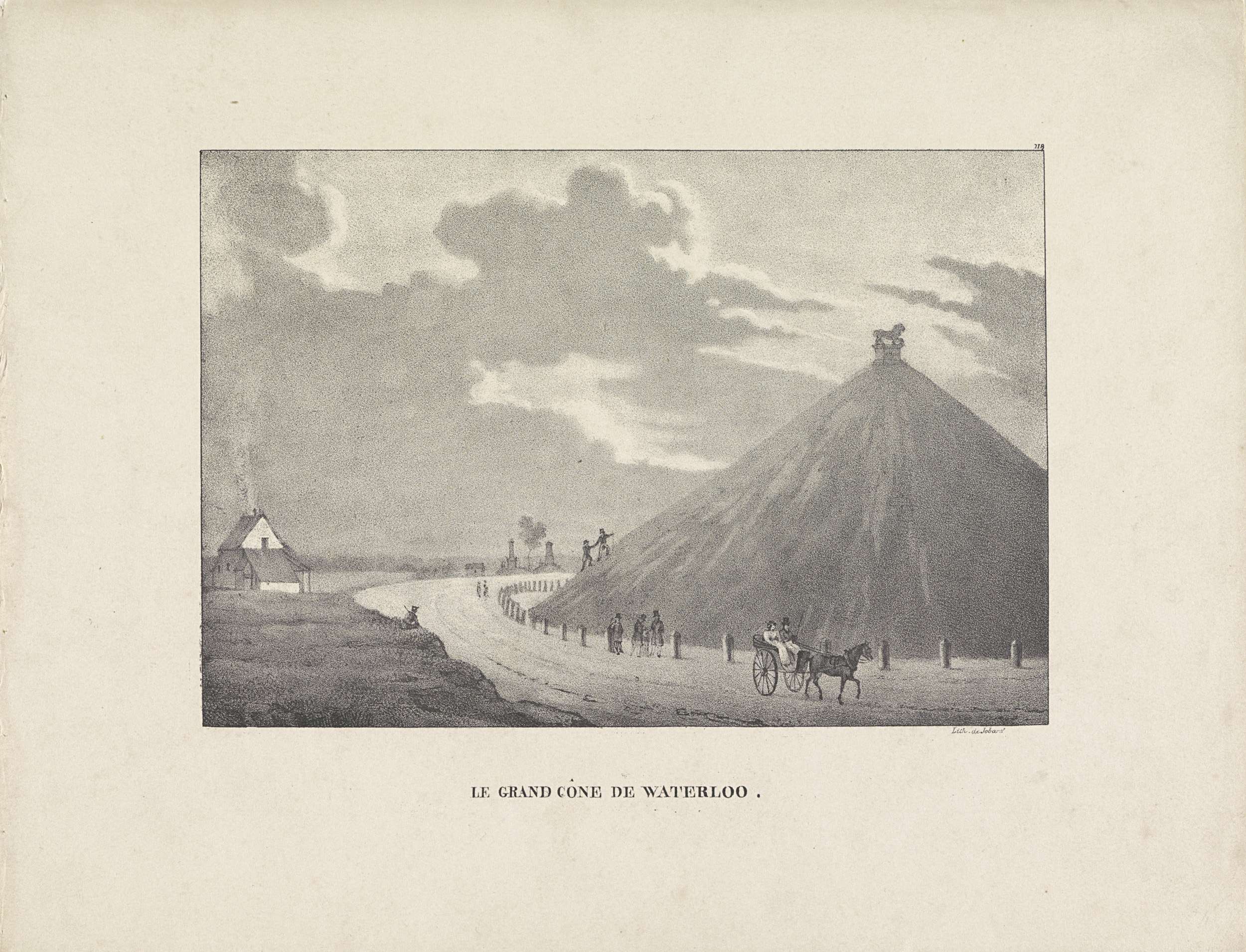 Gezicht op de piramide met het monument de Leeuw van Waterloo. Monument voor de Slag bij Waterloo van 18 juni 1815, gebouwd tussen 1823-1825. Genummerd rechtsboven: 118.