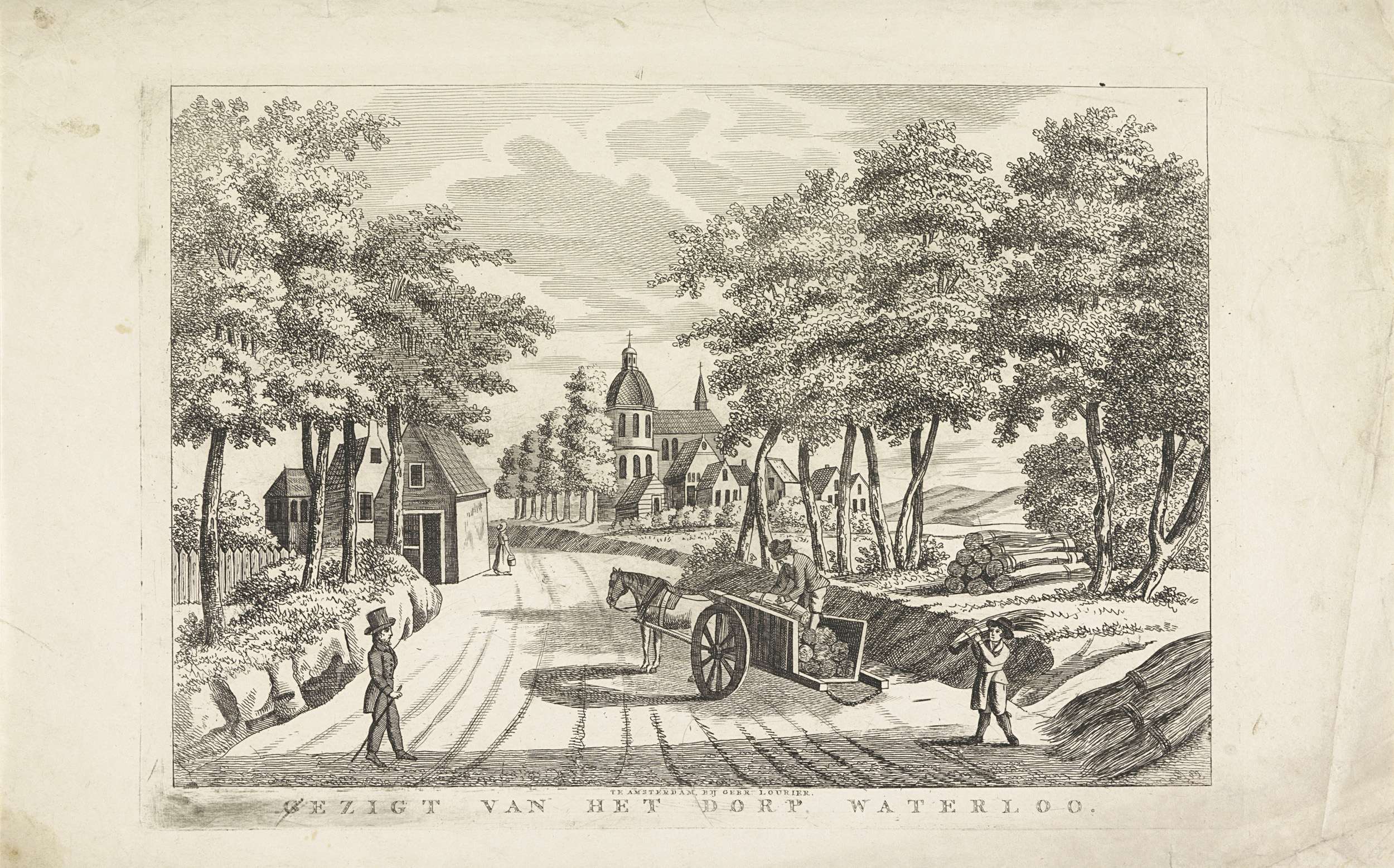 Gezicht in het dorp Waterloo. In de verte de Sint-Jozefskerk, op de voorgrond laden mannen takkenbossen in een wagen. Omgeving van de Slag bij Waterloo van 18 juni 1815. Zie ook de pendant.