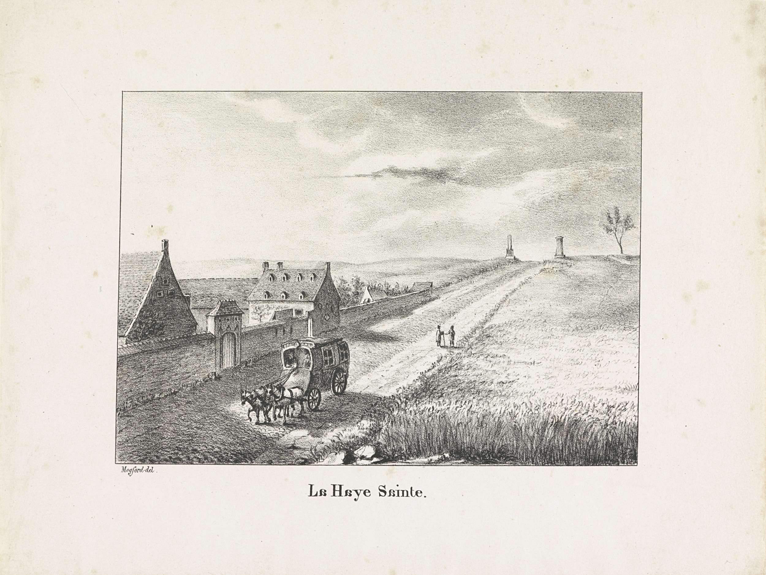 Gezicht op de hoeve La Haye-Sainte in Mont-Saint-Jean, een dorp nabij Waterloo. Omgeving van de Slag bij Waterloo van 18 juni 1815. Een reiskoets passeert op de weg.