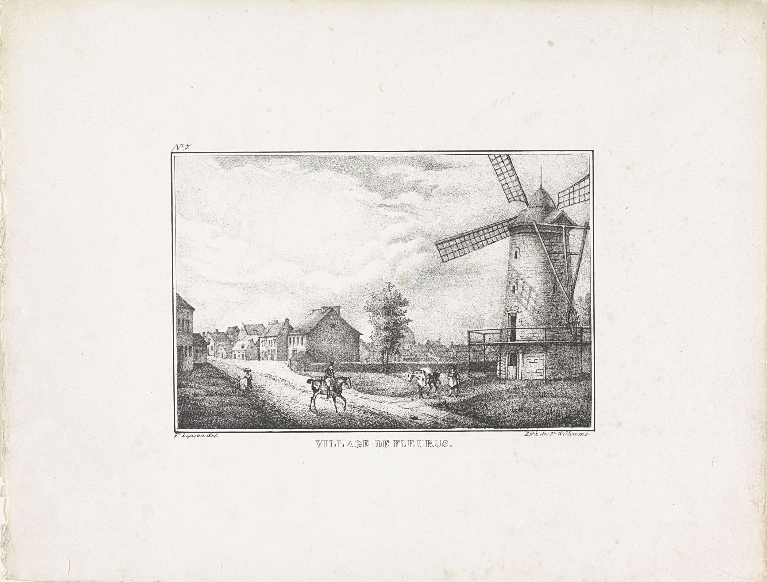 Gezicht in het dorp Fleurus, nabij Waterloo. Op de voorgrond een windmolen. Hier stak Napoleon de rivier de Samber over op weg naar Waterloo. Omgeving van de Slag bij Waterloo van 18 juni 1815. Gemerkt linksboven 'No. 7.'