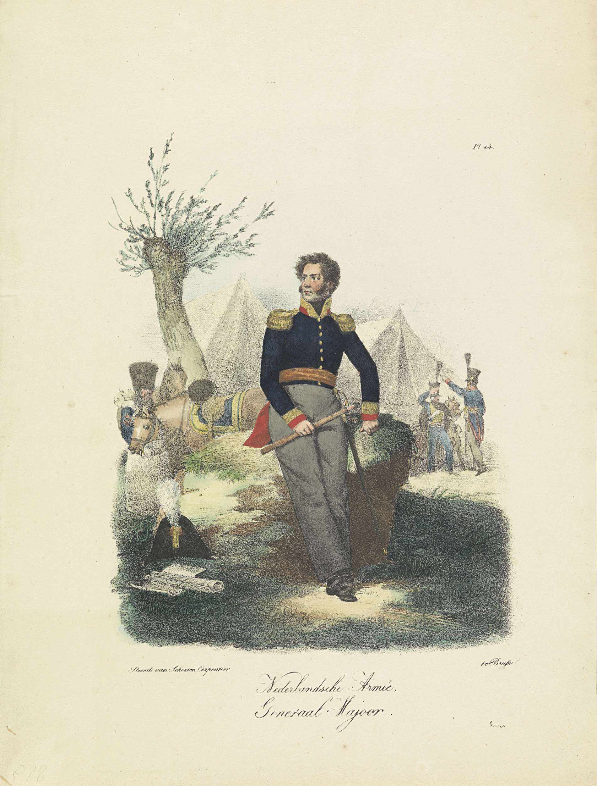 Uniformvoorstelling van een generaal-majoor, geleund tegen een rotsblok. Genummerd rechtsboven: Pl. 14. Onderdeel van de reeks van 53 platen van uniformen van de militairen van het Koninkrijk der Nederlanden in de periode 1820-1825.