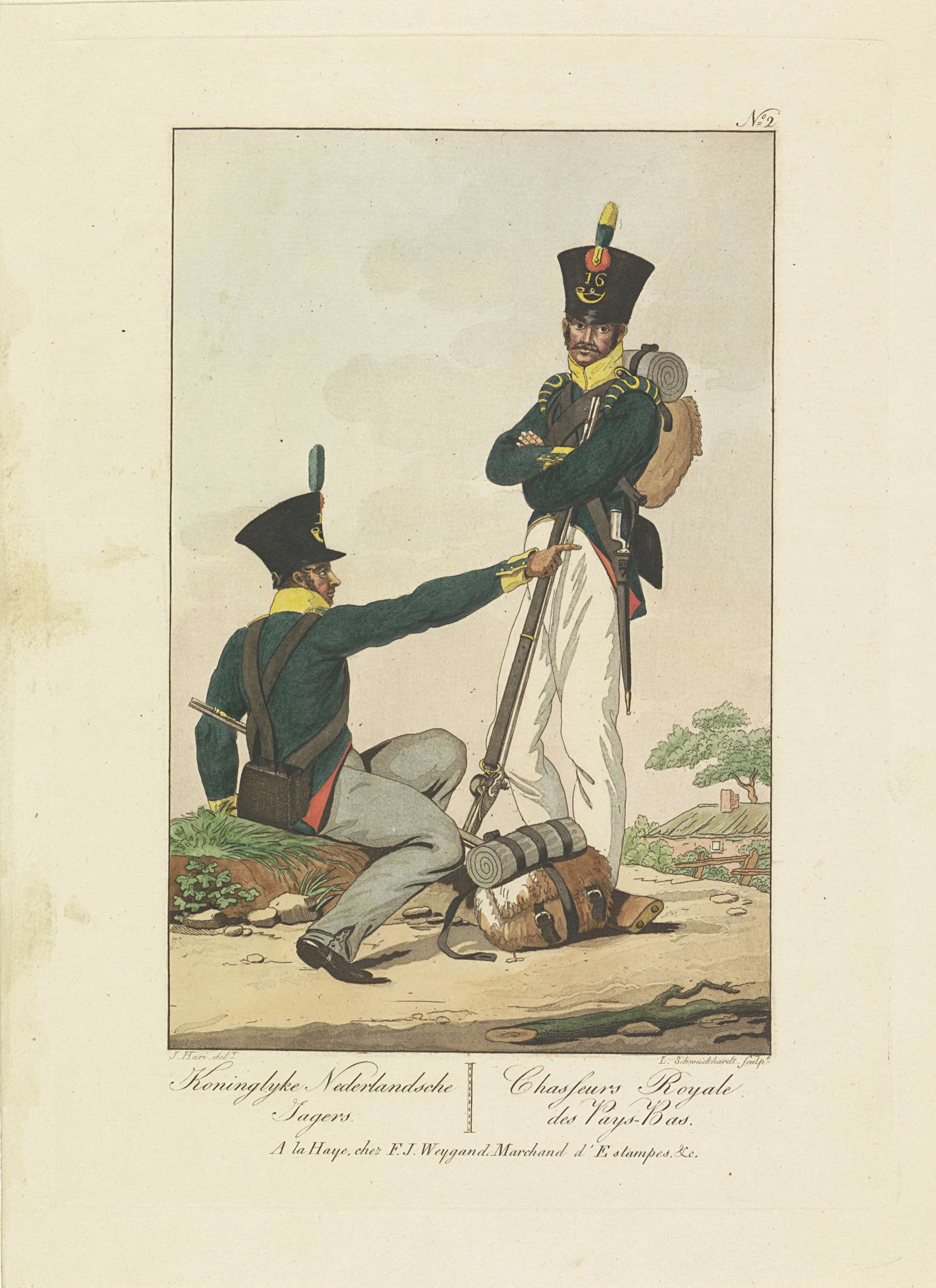 Uniformvoorstelling van twee militairen van het 16e regiment jagers van de infanterie. Genummerd rechtsboven: Pl. 2. Onderdeel van een reeks van zeven platen van uniformen van de militairen van het Koninkrijk der Nederlanden in de periode 1814-1818.