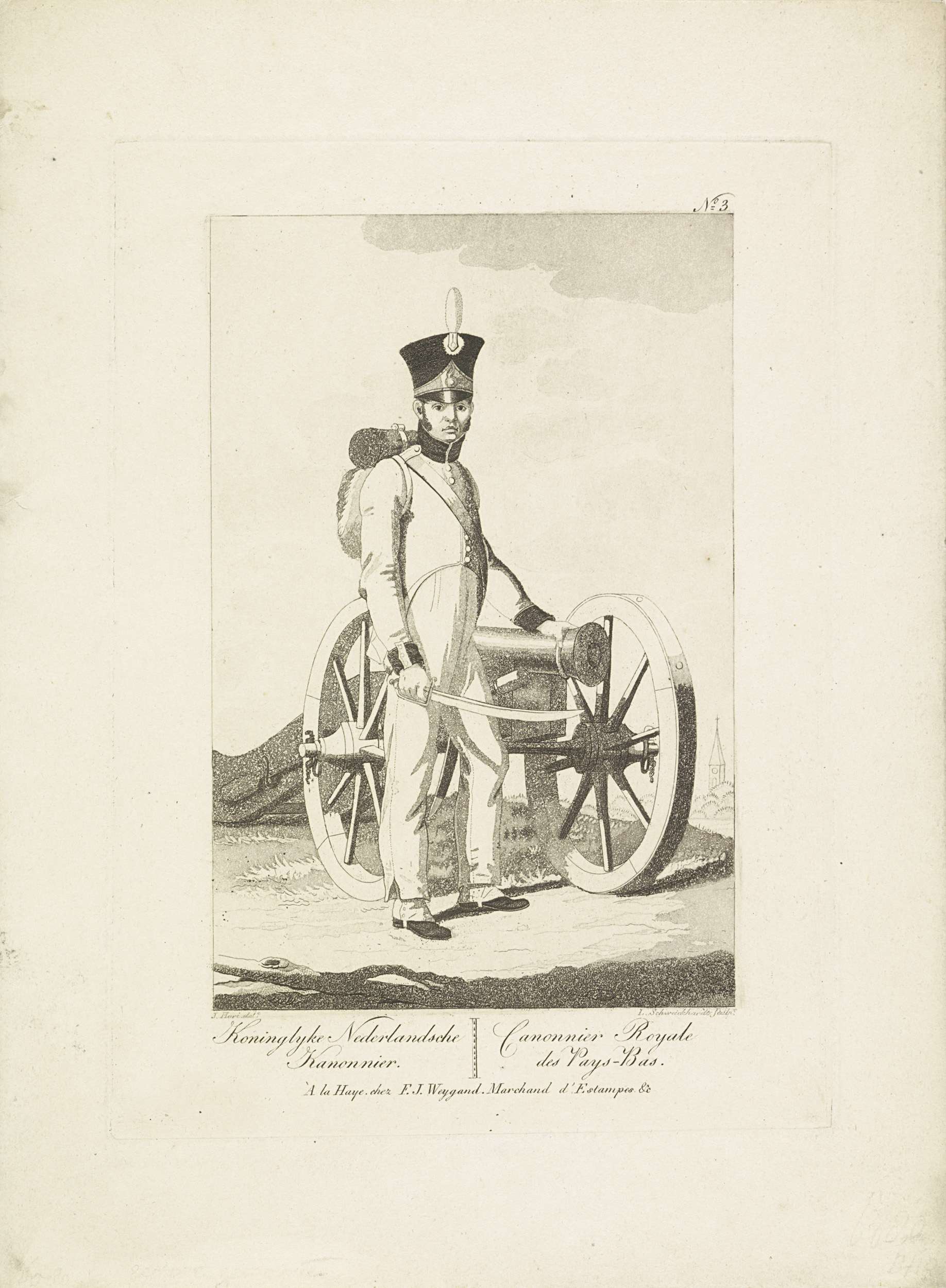 Uniformvoorstelling van een kanonnier staande naast een stuk geschut. Genummerd rechtsboven: Pl. 3. Onderdeel van een reeks van zeven platen van uniformen van de militairen van het Koninkrijk der Nederlanden in de periode 1814-1818.