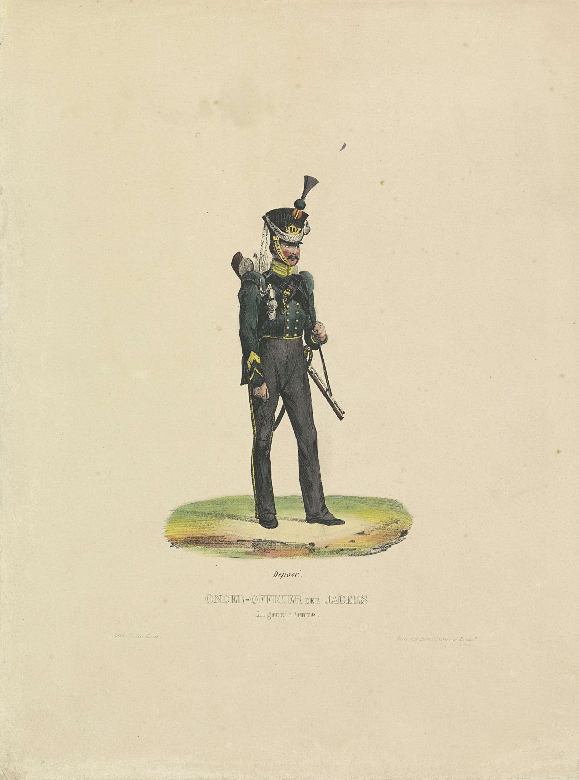 Uniformvoorstelling van een staande onderofficier van de jagers, in grote tenue. Onderdeel van een reeks van platen van uniformen van de militairen van het Koninkrijk der Nederlanden in de periode 1820-1825.
