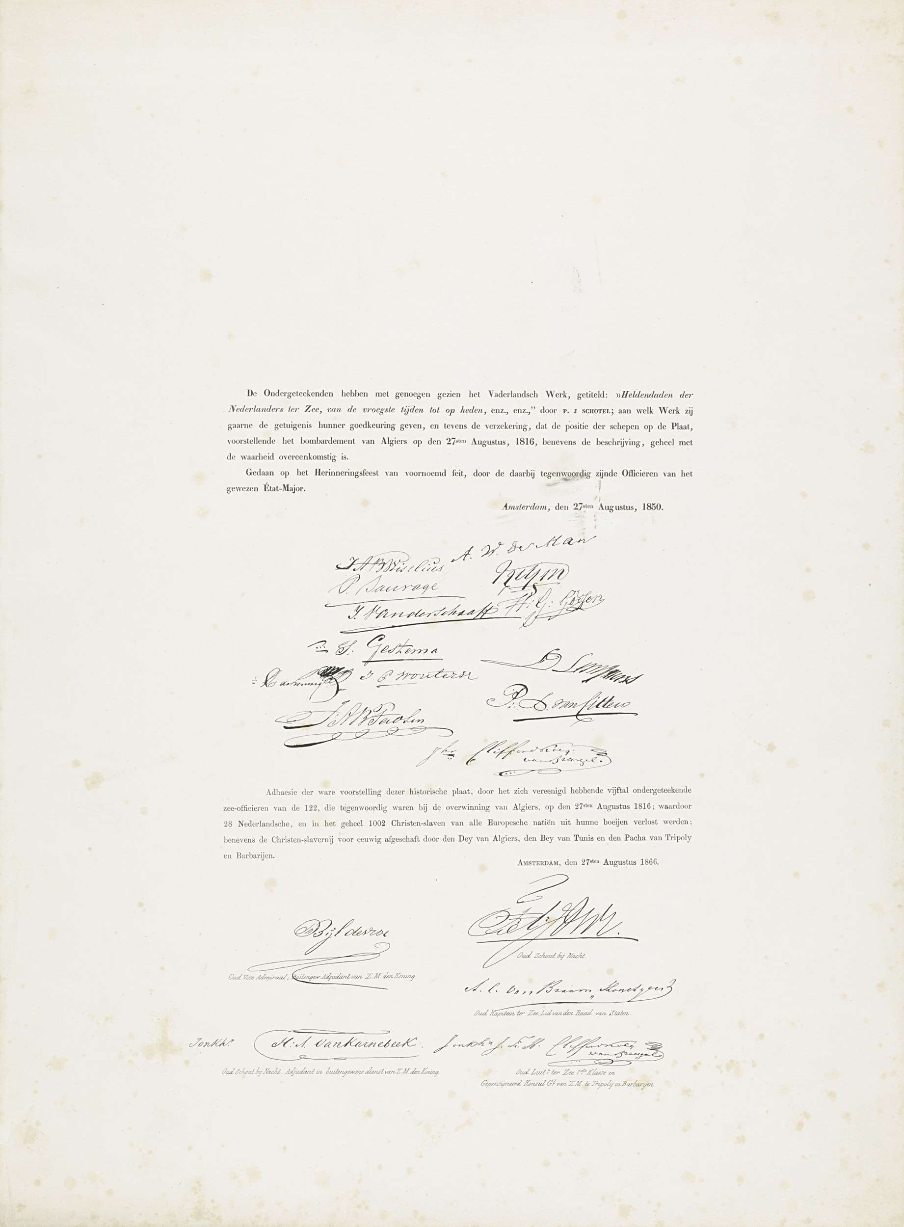 Blad met de namen en handtekeningen van een groep personen die verklaren dat de voorstelling van het bombardement van Algiers in de nacht van 26-27 augustus 1816 door de gecombineerde Engels-Nederlandse vloot met de waarheid overeenkomstig is, gedaan op het Herinneringsfeest te Amsterdam op 27 augustus 1850. Daaronder op hetzelfde blad de namen en handtekeningen ...