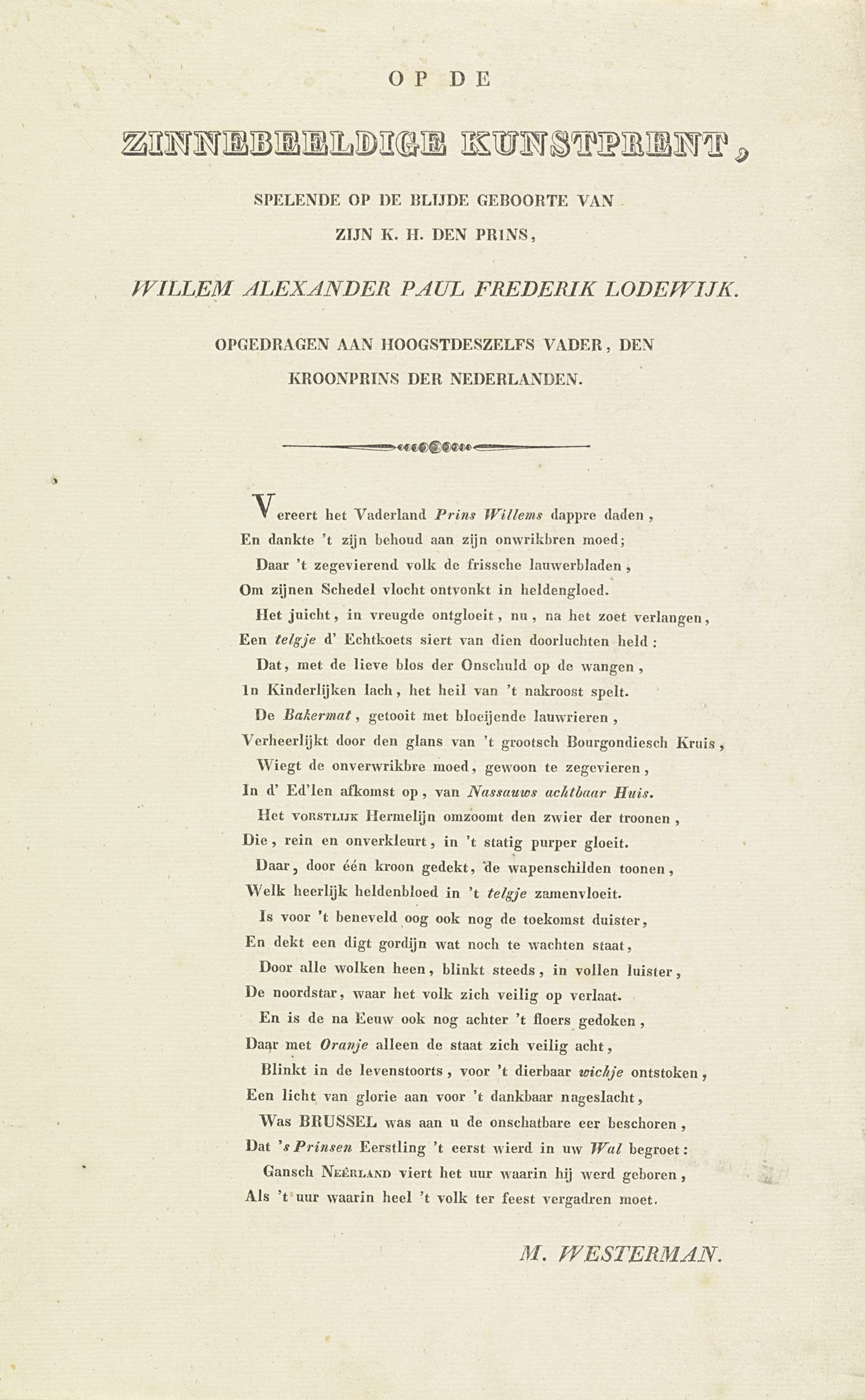 Tekstblad met een verklaring in rijmvorm van de voorstelling van de prent met de allegorie op de geboorte van Willem Alexander Paul Frederik Lodewijk, de erfprins van Oranje en latere koning Willem III, op 19 februari 1817. Gedicht van 28 regels.