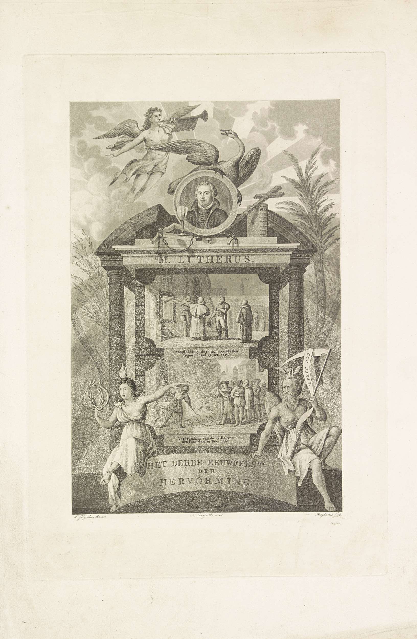 Monument voor het derde eeuwfeest van de Hervorming, 1517-1817. Allegorische voorstelling met centraal een monument bekroond met een portret van Martin Luther en een zwaan. In het monument twee voorstellingen. Boven het aanplakken door Luther van de 95 stellingen in Wittenberg op 31 oktober 1517. Daaronder het verbranden van de pauselijke bul en wetboeken te ...