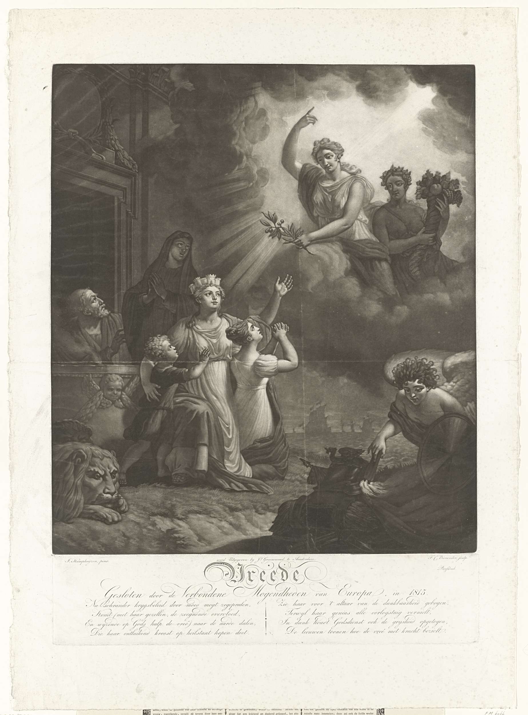 Allegorie op de Tweede Vrede van Parijs, 20 november 1815. Een allegorische vrouwenfiguur met stedenkroon (de Aarde) met twee kinderen (volgende generatie) ziet uit naar het naderen uit de hemel van de Vrede en de Overvloed. Achter hen een altaar met een grijsaard (de Mensdom) en de staande Godsdienst. Rechts verbrandt een genius met een ...