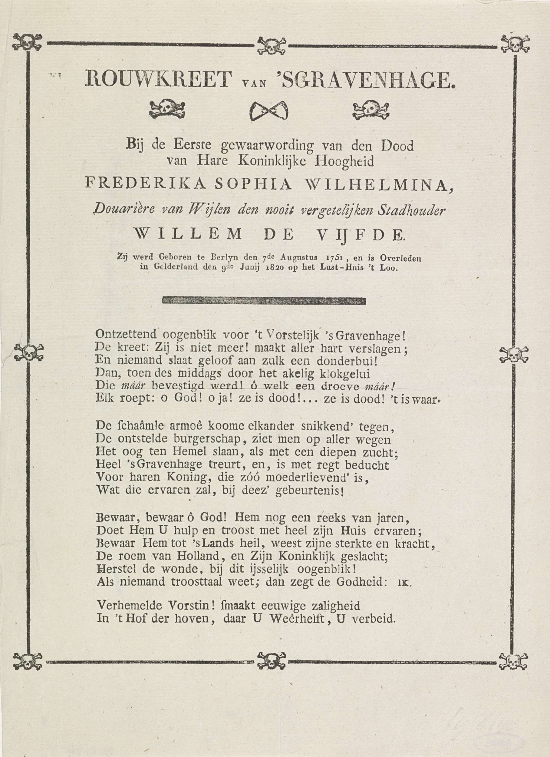 Vers op het overlijden op 9 juni 1820 van Wilhelmina prinses-douairière van Oranje-Nassau, weduwe van prins Willem V. Om de tekst een kader van zwarte lijnen en doodshoofden.