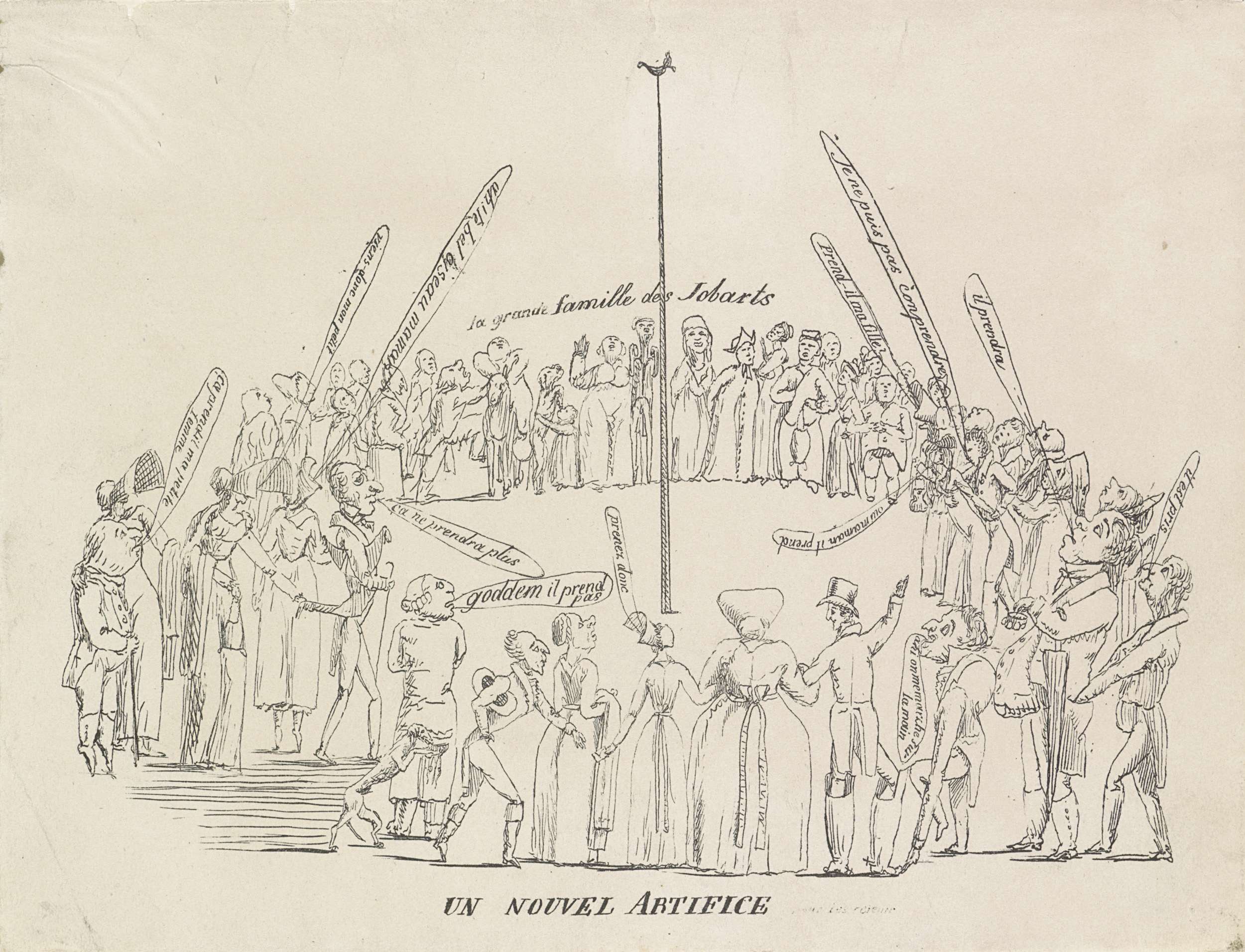 Spotprent op het mislukte vuurwerk tijdens de viering van het 450-jarig jubileum van het Sacrament van Mirakel te Brussel, 16-30 juli 1820. Een groep toeschouwers verzameld rond een vogel op een paal, een deel hiervan aangeduid als 'la grande famille des Jobarts'.