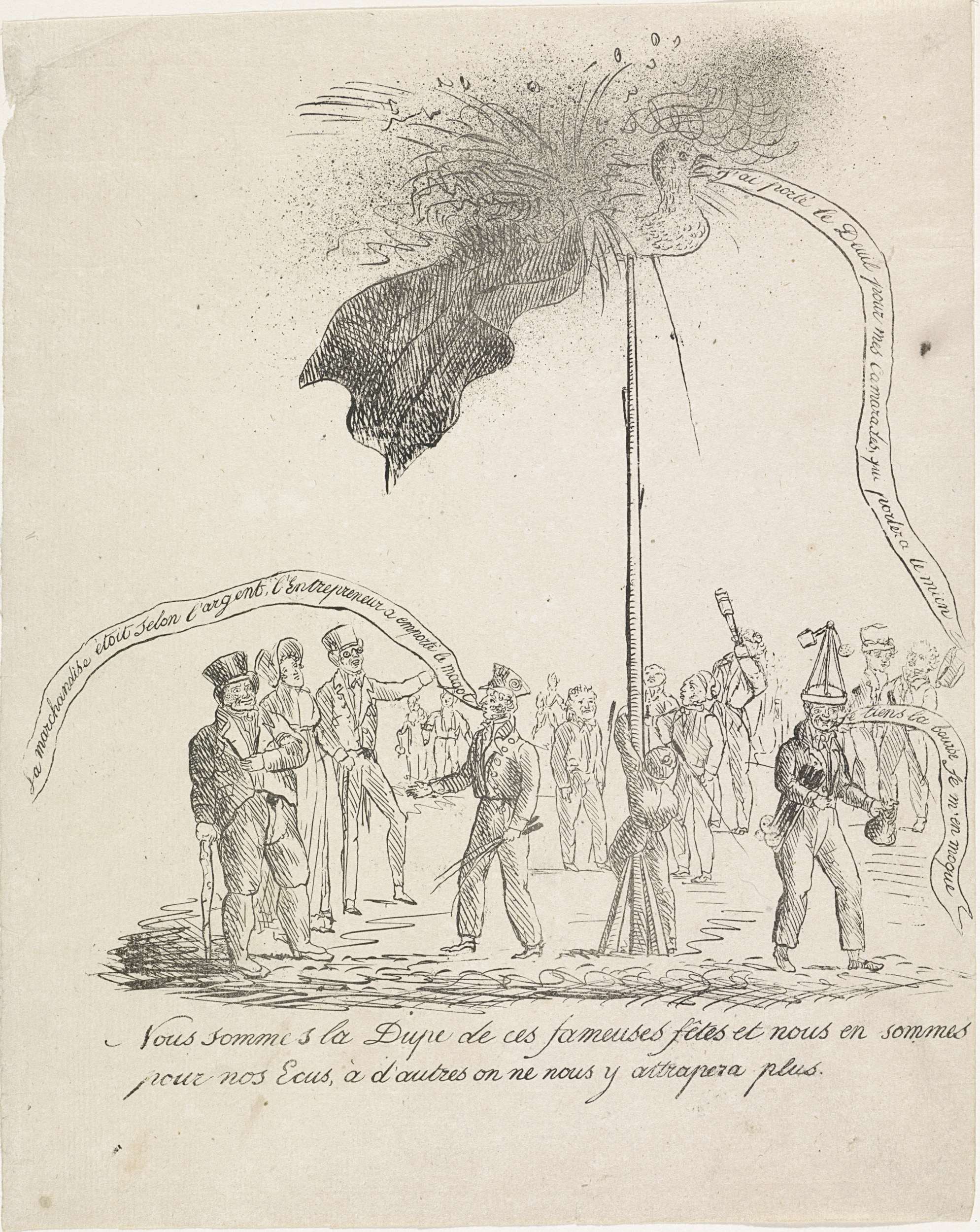 Spotprent op het mislukte vuurwerk tijdens de viering van het 450-jarig jubileum van het Sacrament van Mirakel te Brussel, 16-30 juli 1820. Uit de vogel op de paal komt vuur en rook, rechts maakt de leverancier zich lachend met een geldzak uit de voeten. Om de paal staan toeschouwers.