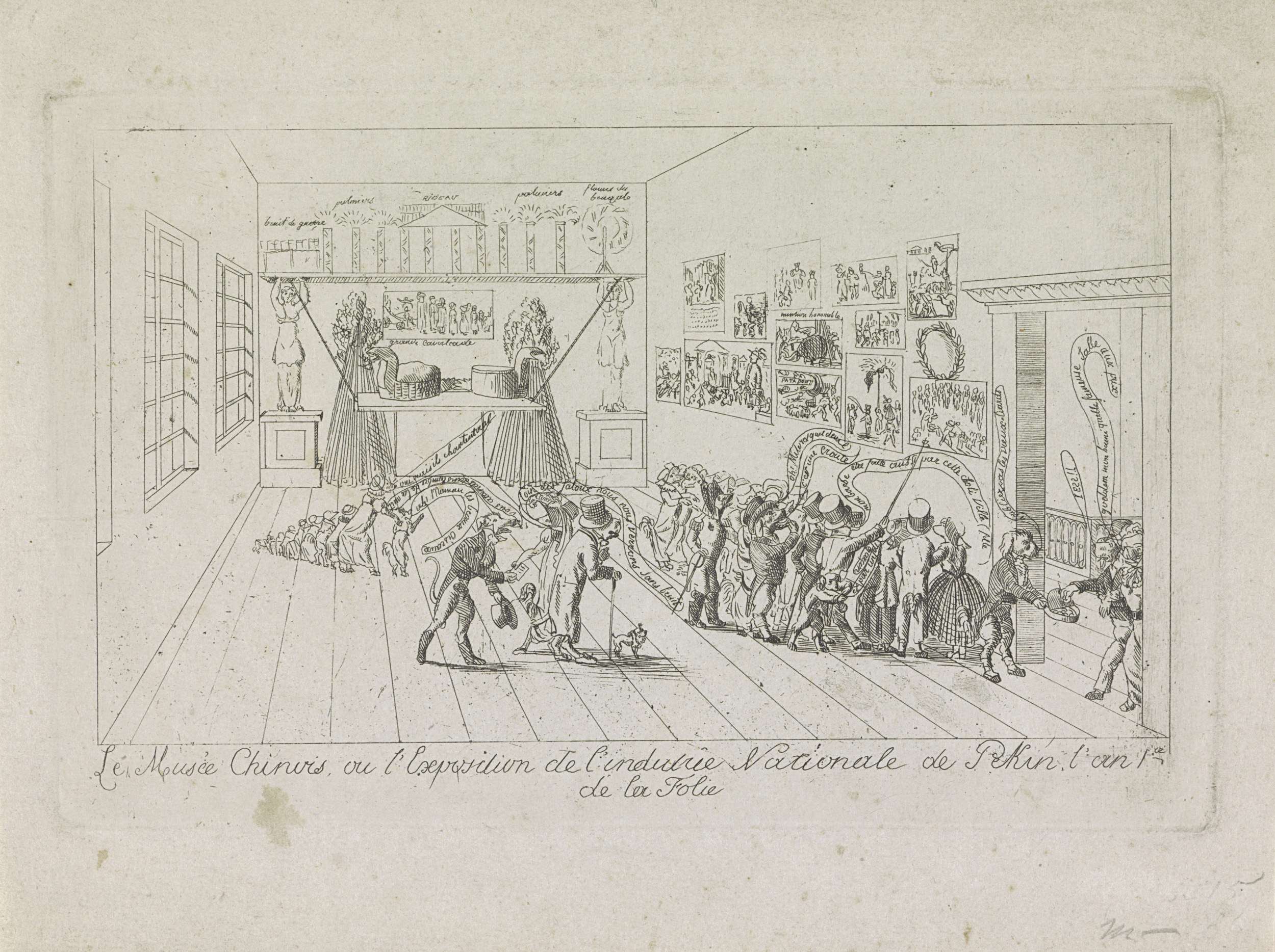 Tentoonstelling van spotprenten op de mislukte viering van het 450-jarig jubileum van het Sacrament van Mirakel te Brussel, 16-30 juli 1820. In een zaal hangen de spotprenten aan een muur, op de achtergrond de mislukte vuurwerkstellage. De bezoekers aan de tentoonstelling zijn allemaal honden. Verwijst ook naar de vijfjaarlijkse tentoonstelling gehouden te Gent 1-24 augustus ...