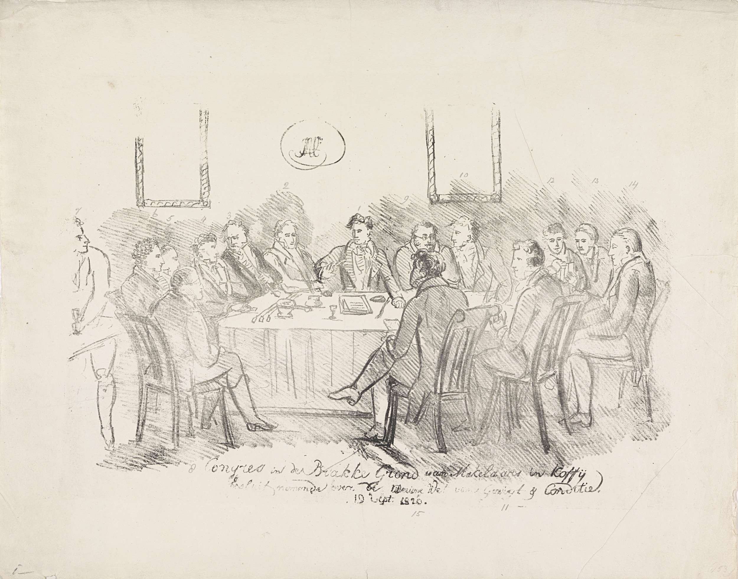 Bijeenkomst van makelaars in koffie in de herberg de Brakke Grond aan de Nes te Amsterdam op 19 september 1820. Een groep van mannen zittend rond een tafel. Centraal de voorzitter Samuel Voûte, links van hem de tekenaar Julianus Amtonius Heintzen. De afgebeelde personen met potlood genummerd van 1 tot en met 15, bij de ...