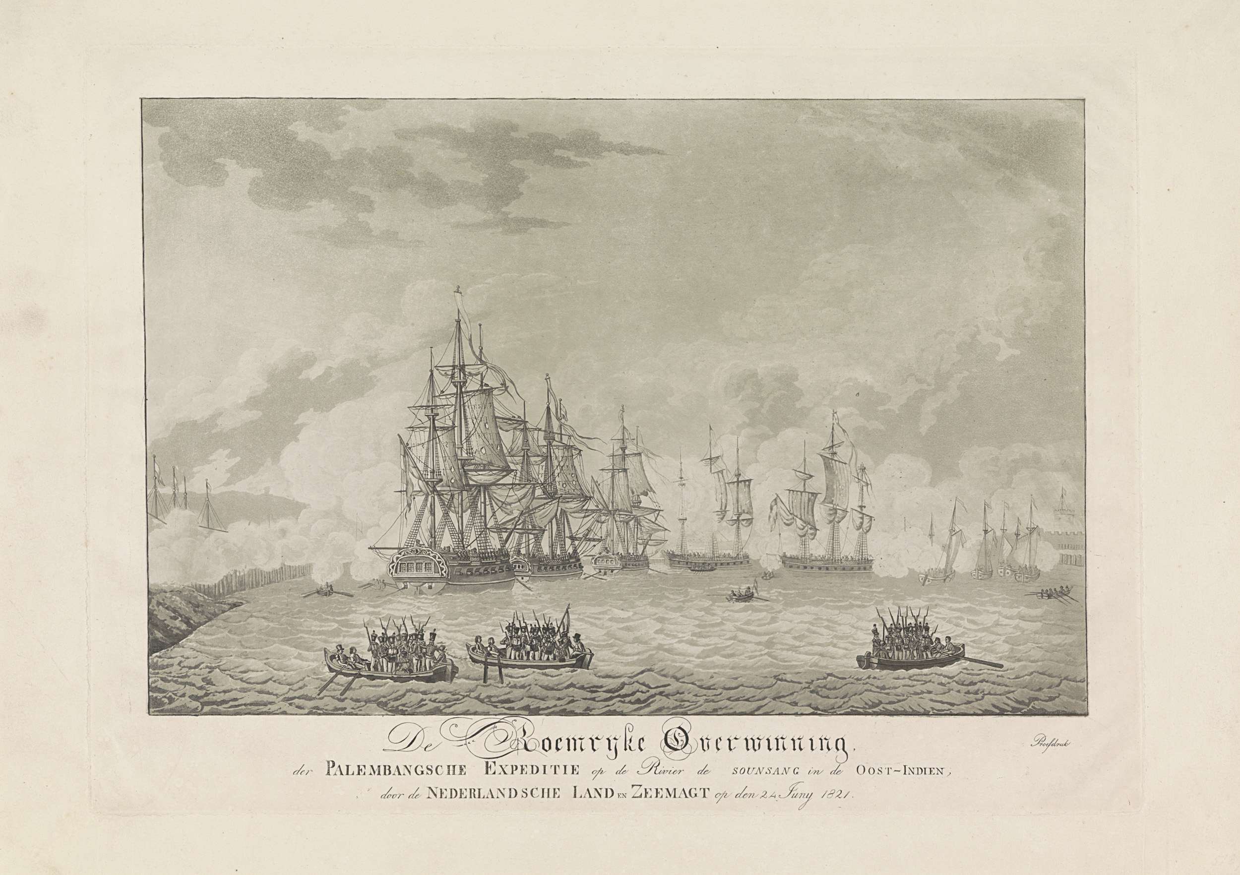 Beschieting van de kustbatterijen gelegen aan de rivier in Palembang op Sumatra door Nederlandse oorlogsschepen onder bevel van generaal H.M. de Kock, 24 juni 1821. Op de voorgrond manschappen in sloepen. Bij de prent behoort een afzonderlijke verklaring. Zie ook de pendant.