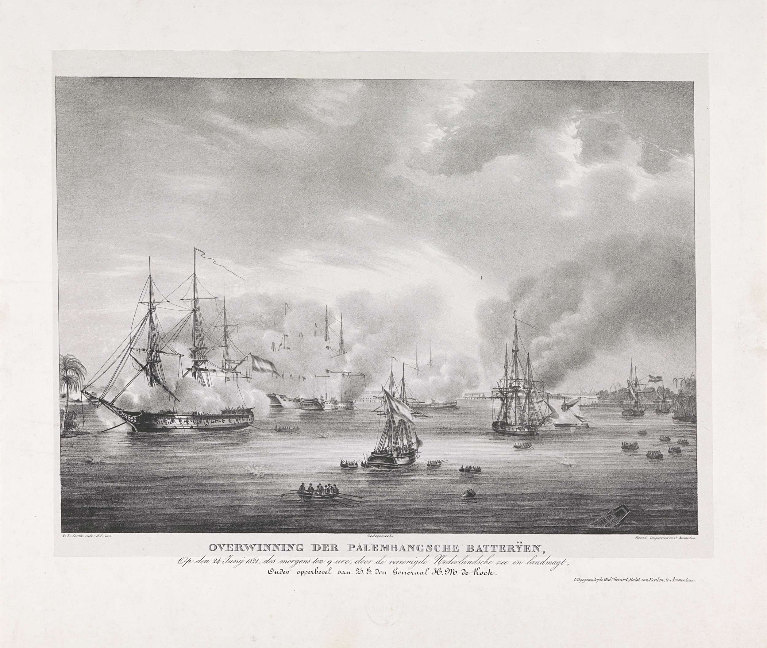 Beschieting van de kustbatterijen gelegen aan de rivier in Palembang op Sumatra door Nederlandse oorlogsschepen onder bevel van generaal H.M. de Kock, 24 juni 1821.