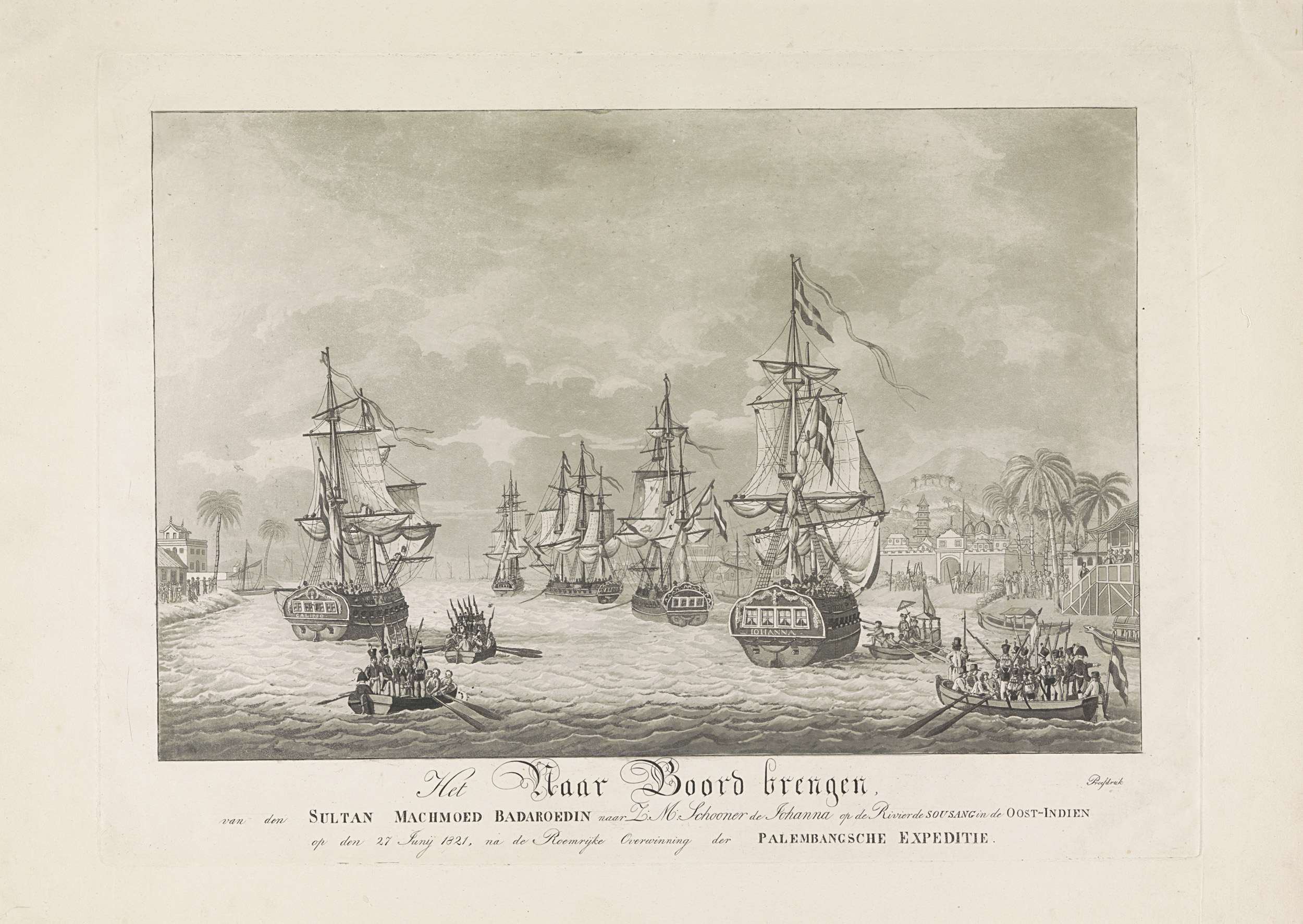 Sultan Mahmud Badaruddin II doet volgens afspraak met de Nederlanders ten gunste van zijn zoon Ahmad Najamuddin III afstand van de troon. Hij wordt vanuit een prauw aan boord van de Johanna genomen, 27 juni 1821. Links op de wal het paleis van de sultan. Na de Tweede expeditie naar Palembang op Sumatra door Nederlandse ...