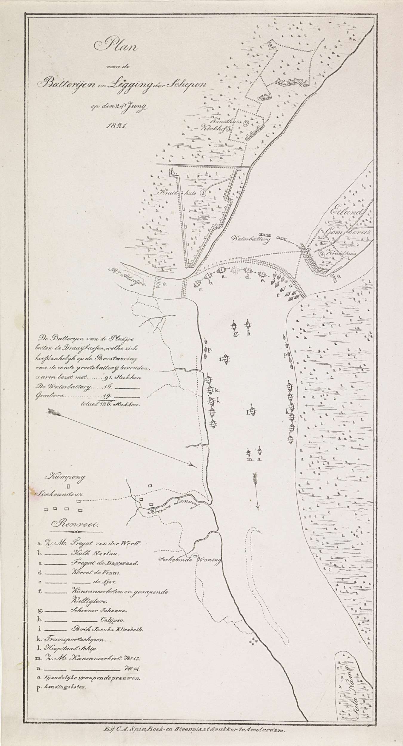 Kaart van de rivier bij Palembang met de ligging van de vijandelijke kustbatterijen en de Nederlandse oorlogsschepen op 24 juni 1821 tijdens de Tweede expeditie naar Palembang op Sumatra. Links de legenda a-p. Zie ook de pendant.