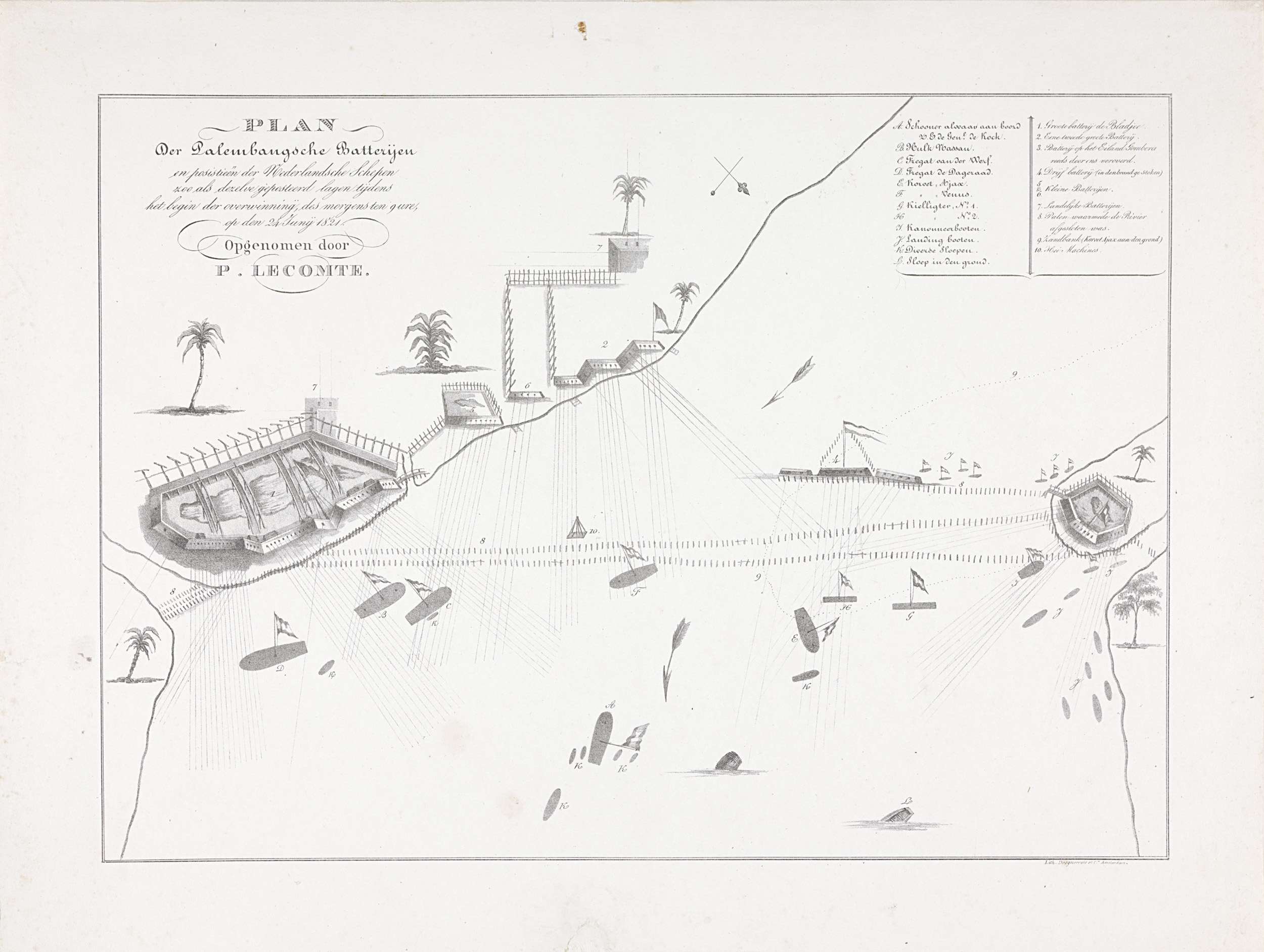Plan van de rivier bij Palembang met de ligging van de vijandelijke kustbatterijen en de Nederlandse oorlogsschepen in de ochtend van 24 juni 1821 tijdens de Tweede expeditie naar Palembang op Sumatra. Rechtsboven de legenda A-L en 1-10.