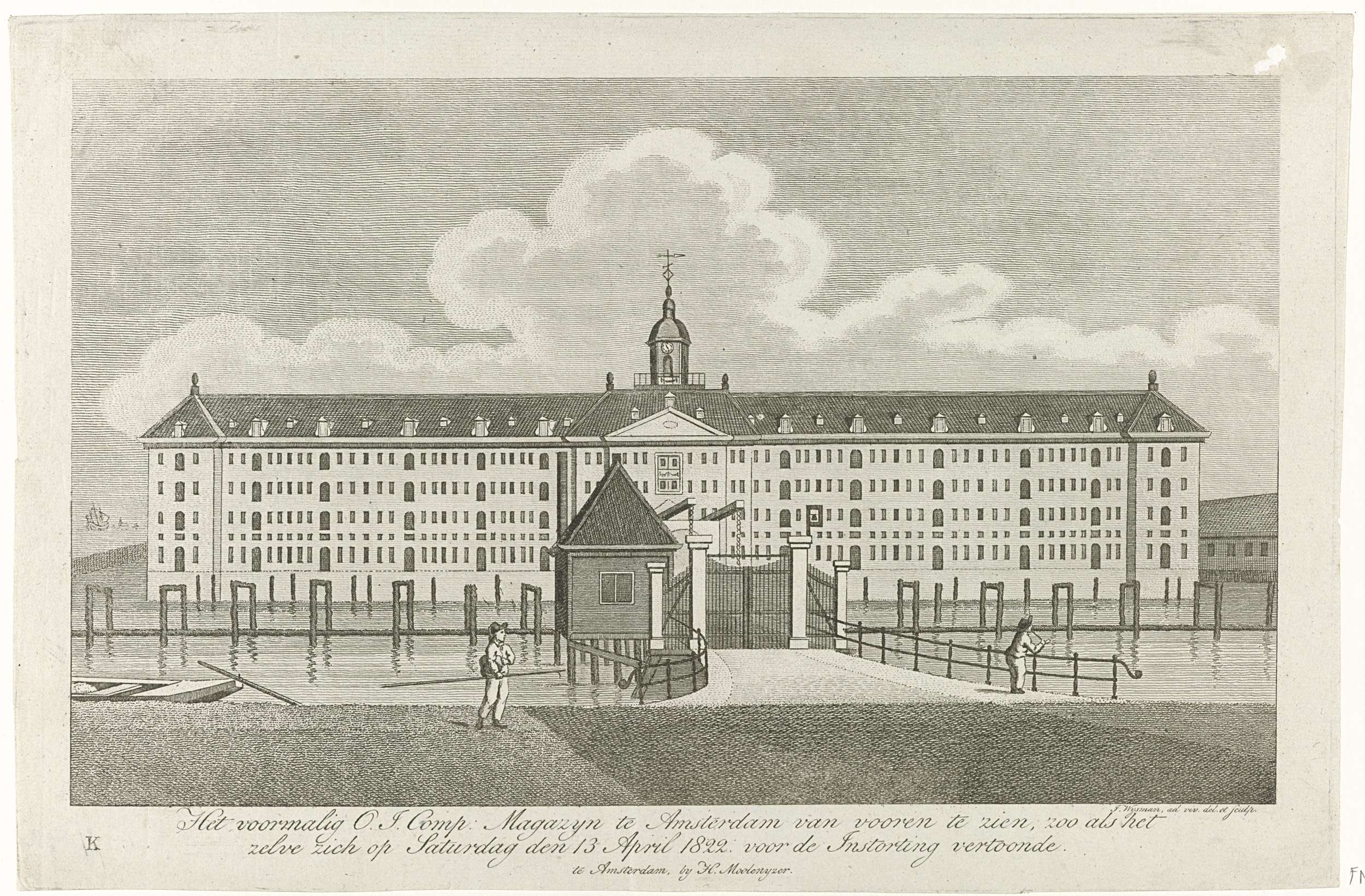 Gezicht op het Oost-Indisch Zeemagazijn te Amsterdam, in welstand vóór de instorting op 13 april 1822. Linksonder gemerkt 'K'. Zie ook de pendant.