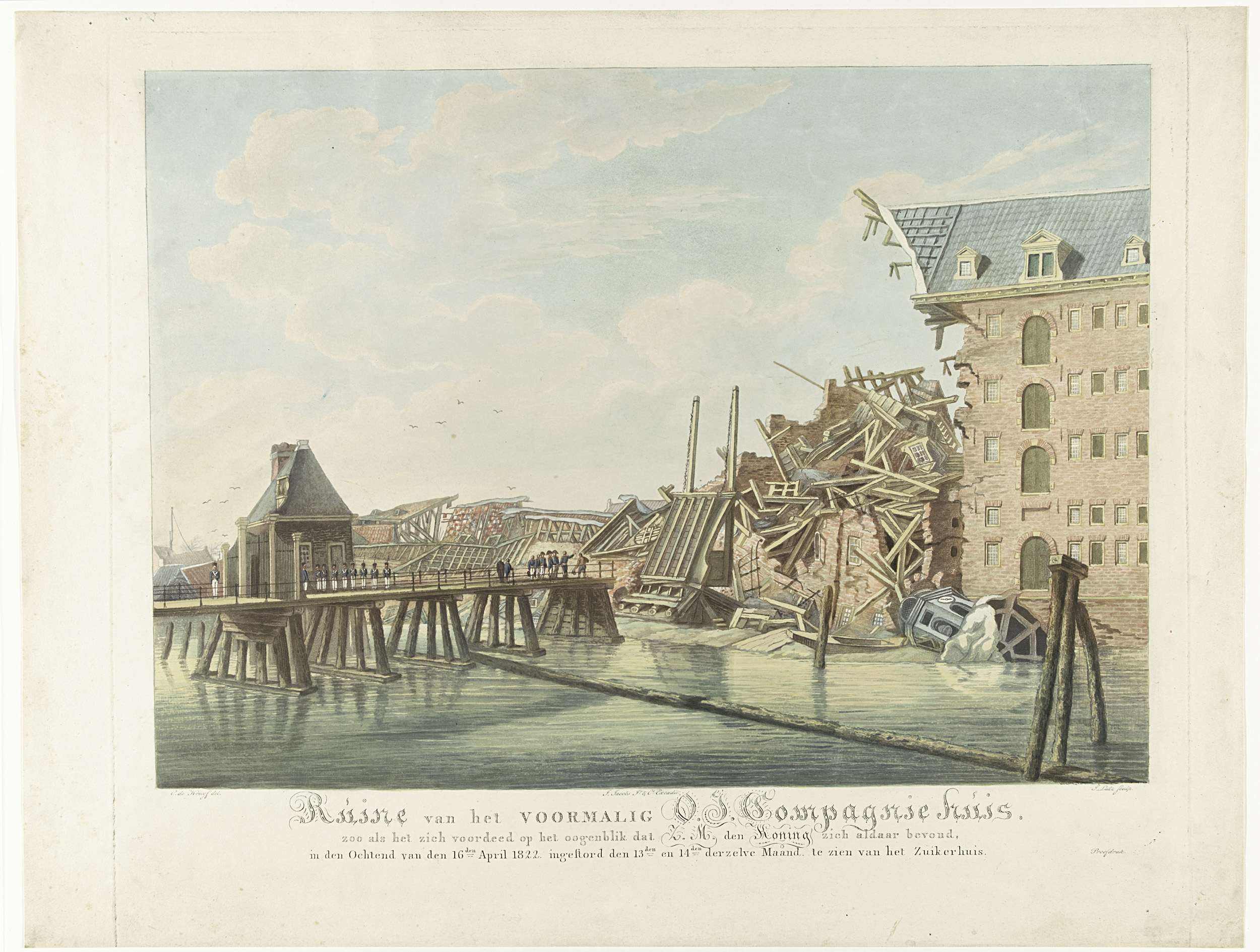 Koning Willem I bezoekt de ruïne van het Oost-Indisch Zeemagazijn te Amsterdam op 16 april, na de instorting op 13-14 april 1822. De koning aanschouwt de ruïnes vanaf de brug. Zie ook de pendant.