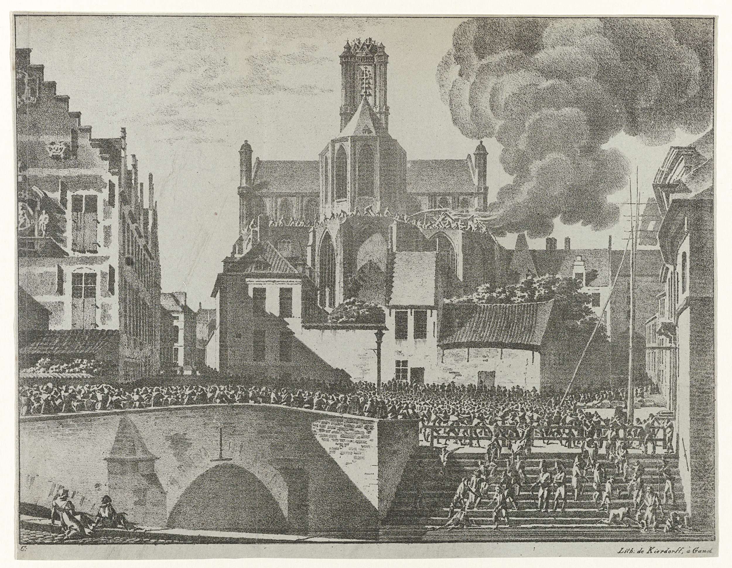 Brand in de Sint-Baafskathedraal te Gent, 11 september 1822. Op de voorgrond een grote menigte toeschouwers en mensen die in de gracht emmers water vullen.