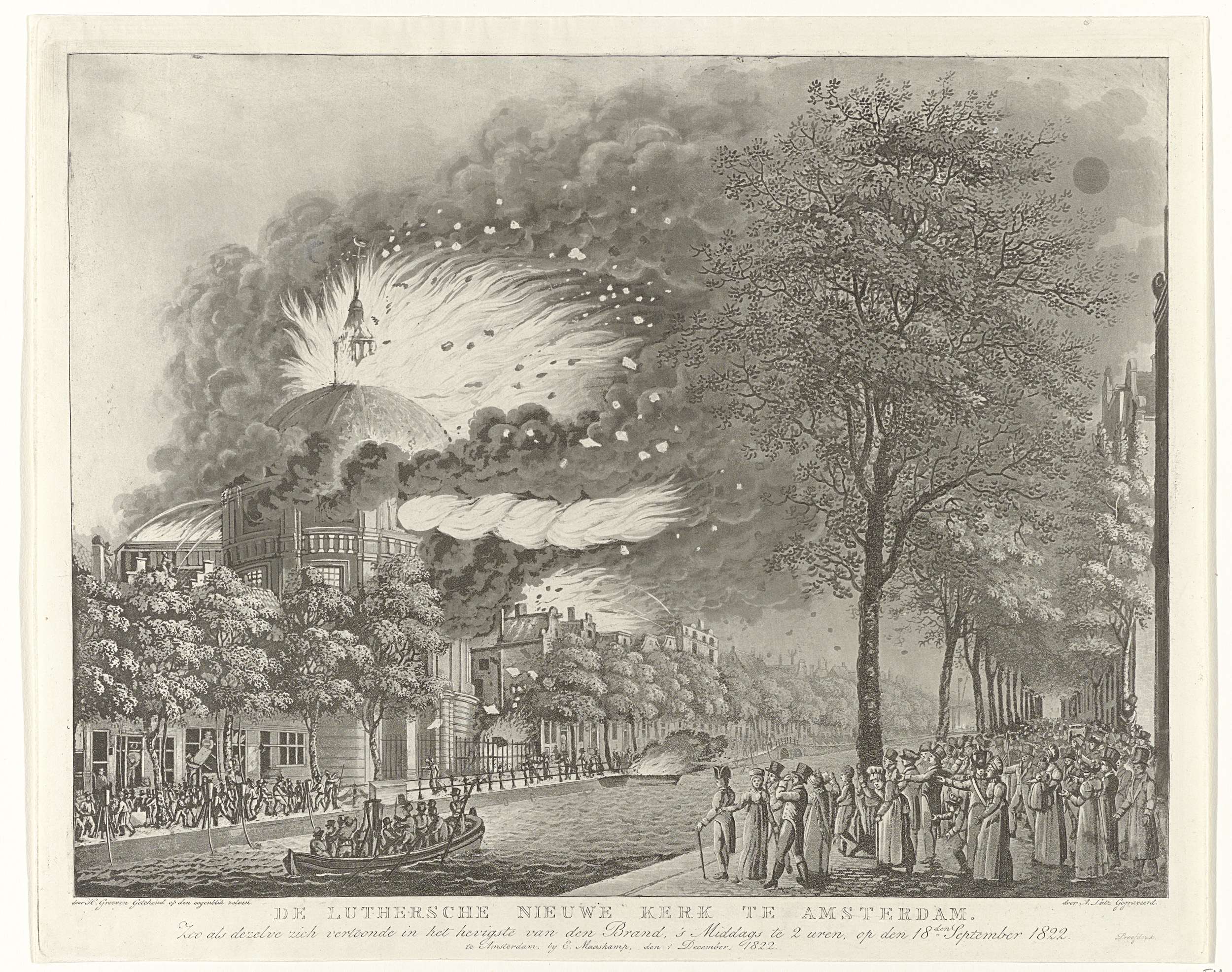 Gezicht op de Koepelkerk of Nieuwe Lutherse Kerk aan het Singel te Amsterdam tijdens de brand van 18 september 1822. Op de voorgrond toeschouwers aan de kade.