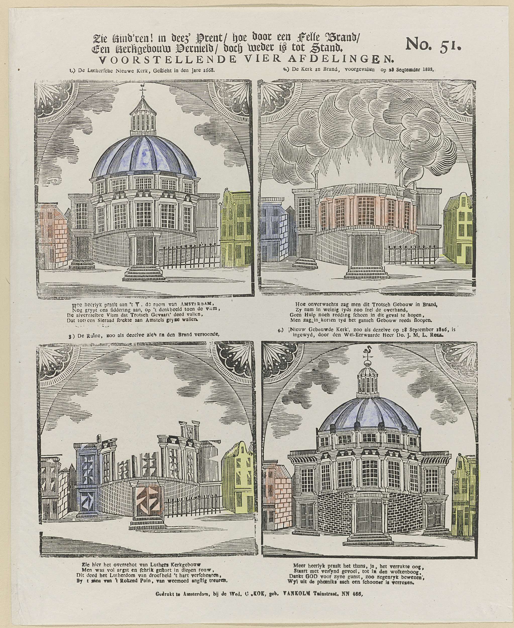 Blad met vier voorstellingen van de Koepelkerk of Nieuwe Lutherse Kerk aan het Singel te Amsterdam, 1: in welstand, 2: tijdens de brand van 18 september 1822, 3: de ruïne na de brand en 4: de herbouwde kerk ingewijd op 18 september 1826. Genummerd rechtsboven: No. 51.
