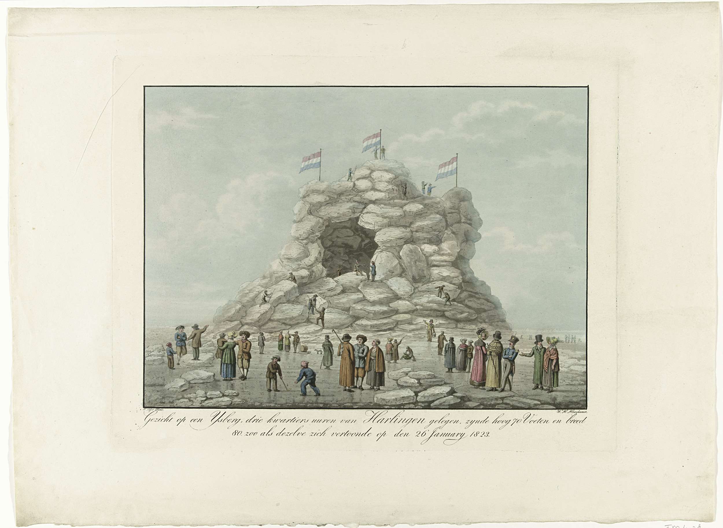IJsberg van kruiend ijs in Friesland in de omgeving van Harlingen, 26 januari 1823. Op de ijsberg klimmen meerdere personen en prijken drie Nederlandse vlaggen. Op de voorgrond bezoekers op het ijs. Zie ook de pendant.