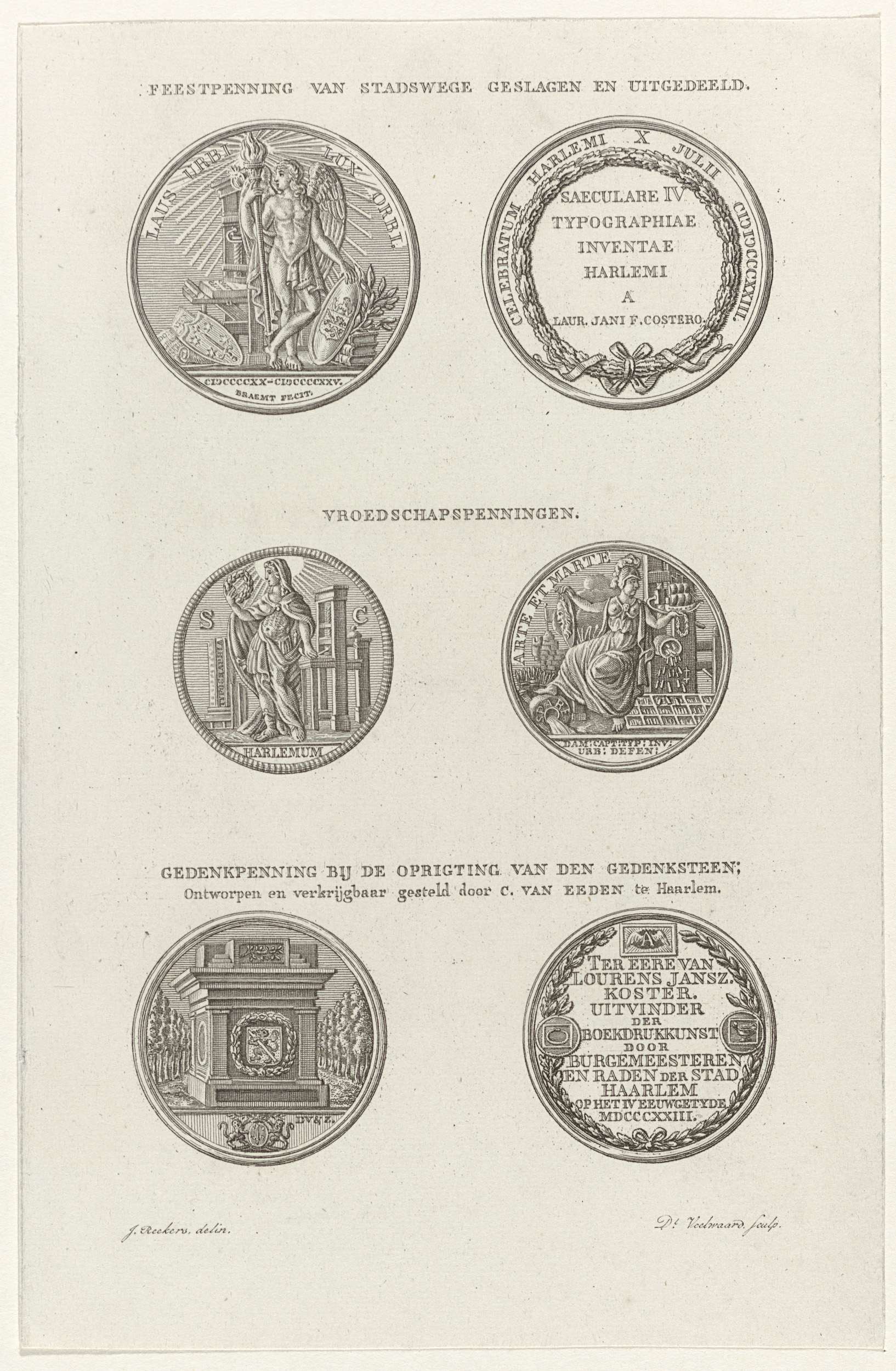 Drie penningen geslagen ter gelegenheid van de viering van het 400-jarige jubileum op 10-11 juli in 1823 van de uitvinding boekdrukkunst door Laurens Jansz. Coster te Haarlem in 1423.