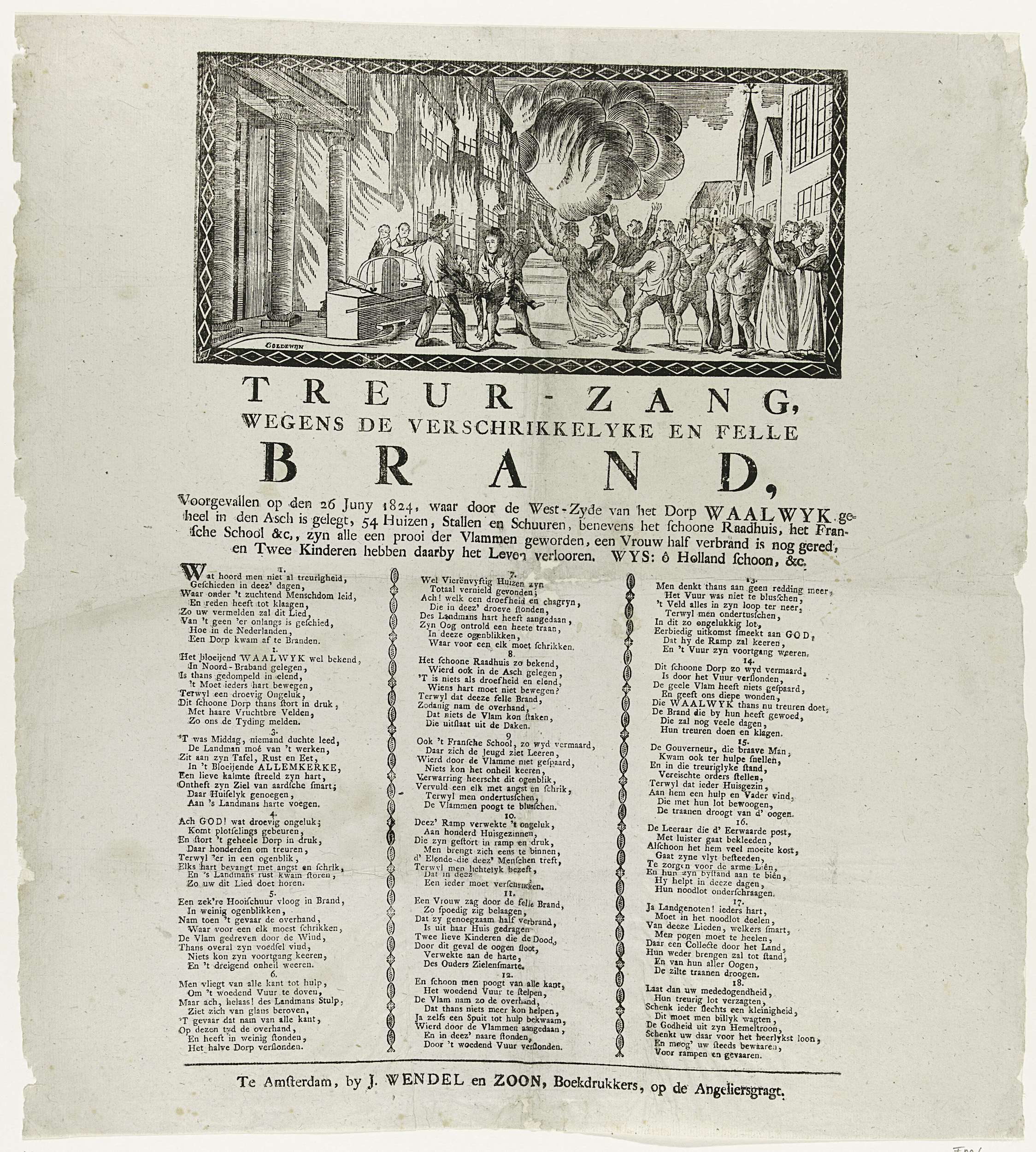 Treurzang op de brand in het dorp Waalwijk op 26 juni 1824. Lied in achttien coupletten. Bovenaan een voorstelling van de brand waarbij een vrouw uit de vlammen wordt gered. Bij de brand werden 54 huizen, het Raadhuis en de Franse school verwoest en verloren twee kinderen het leven.
