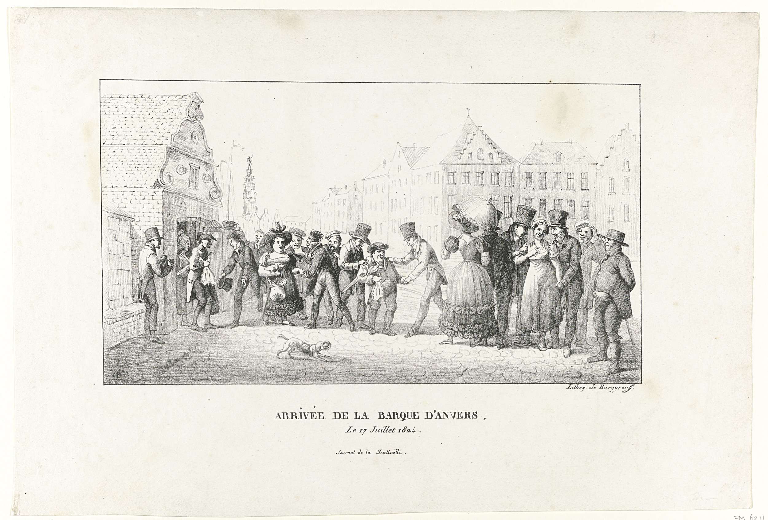 Aankomst van een groep Antwerpenaren die met de boot vanuit Antwerpen op 17 juli 1824 naar Brussel zijn gevaren. De Antwerpenaren arriveren links op de kade en worden door inwoners van Brussel overdreven hartelijk verwelkomd.