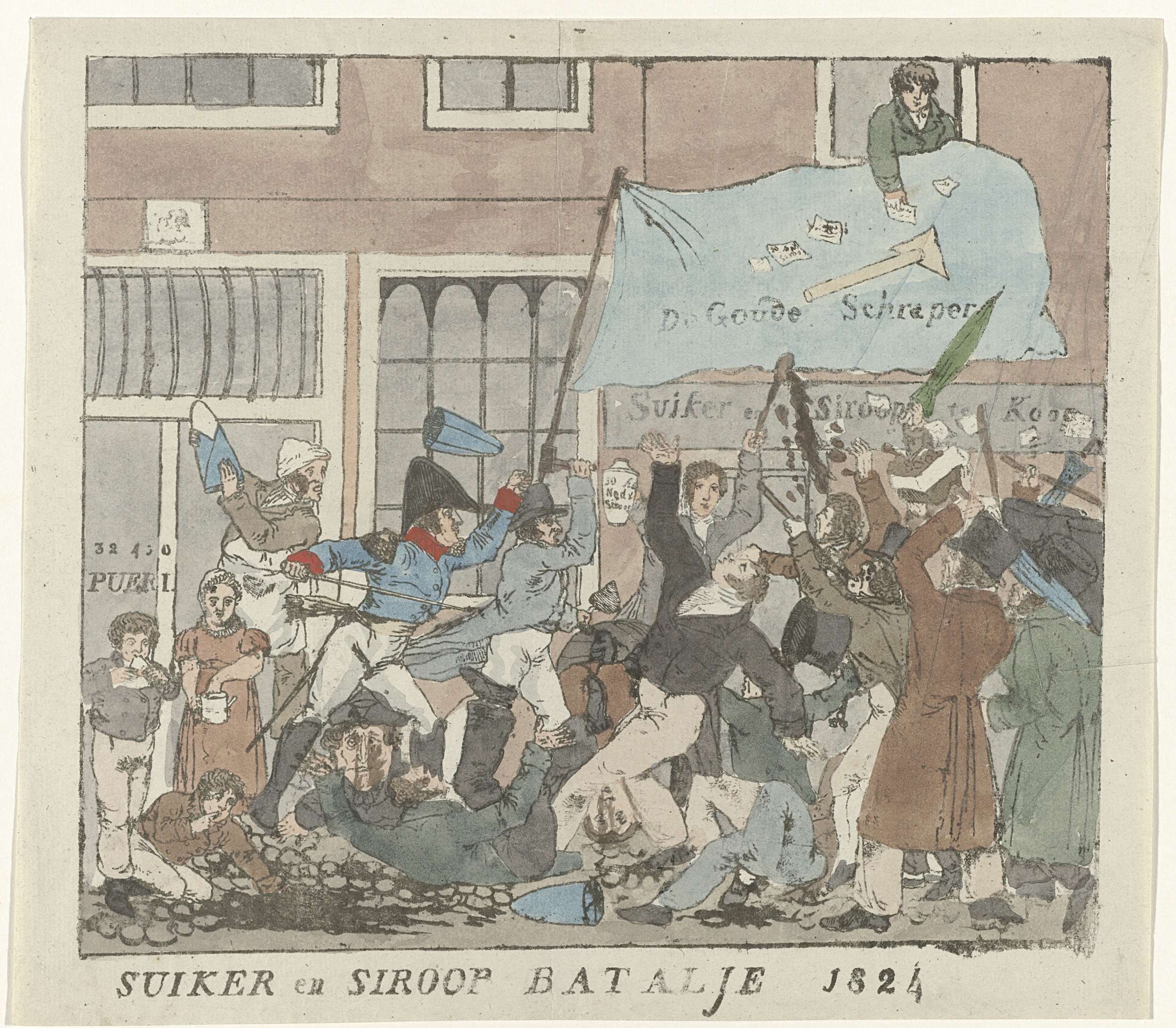 Spotprent op de pogingen van de firma J.H. Rupe & Zn om suiker in het klein te verkopen. Mannen vechten om stroop en suikerbroden op straat voor een winkel genaamd 'De Goude Schraper', waar suiker en stroop te koop wordt aangeboden. Naar aanleiding van het verbod te Amsterdam op de verkoop van suiker en stroop ...