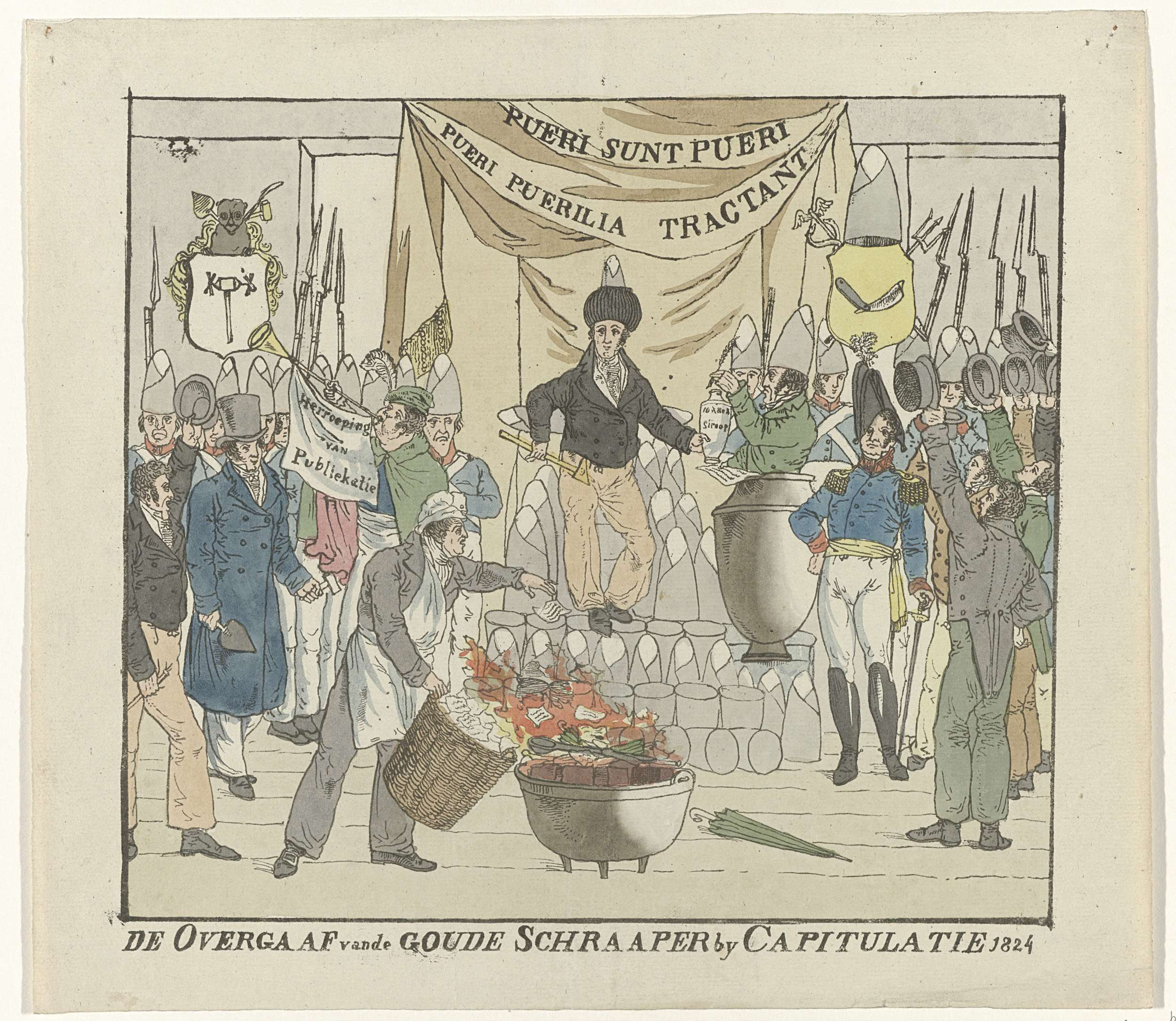 Spotprent op de pogingen van de firma J.H. Rupe & Zn om suiker in het klein te verkopen. Centraal een man met een gouden schraper in de man staande op een troon van suikerbroden. Links en rechts juichende burgers en soldaten met suikerbroden op hun hoofd. Op de voorgrond verbrandt een man documenten in een ...