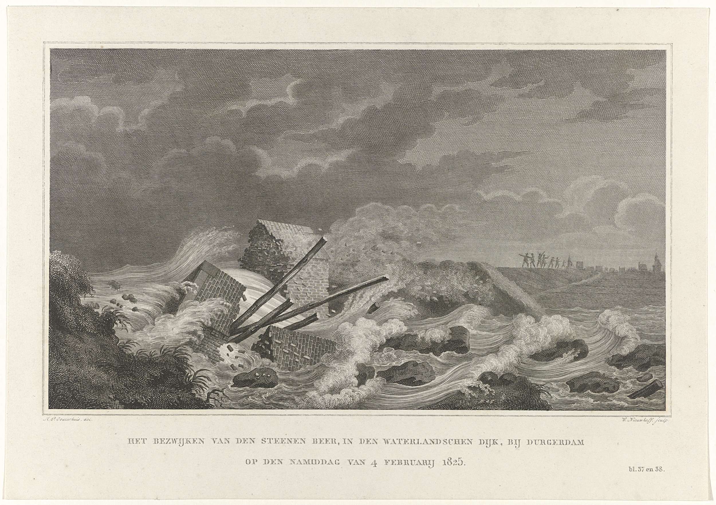 Het bezwijken van de stenen beer in de Waterlandsche dijk bij Durgerdam, 4 februari 1825. Onderdeel van de illustraties in een uitgave over de watersnood van 3-5 februari 1825.