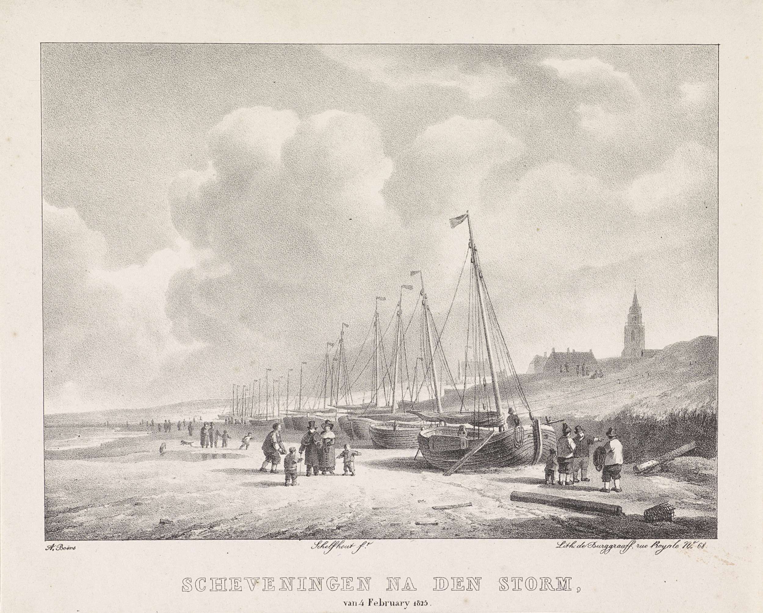 Het strand van Scheveningen na de zware storm van 4 februari 1825. Inwoners van het dorp bekijken de vissersschepen die ver op het strand zijn gesmeten. Onderdeel van een groep illustraties uit een gedenkboek van de watersnood van 1825.