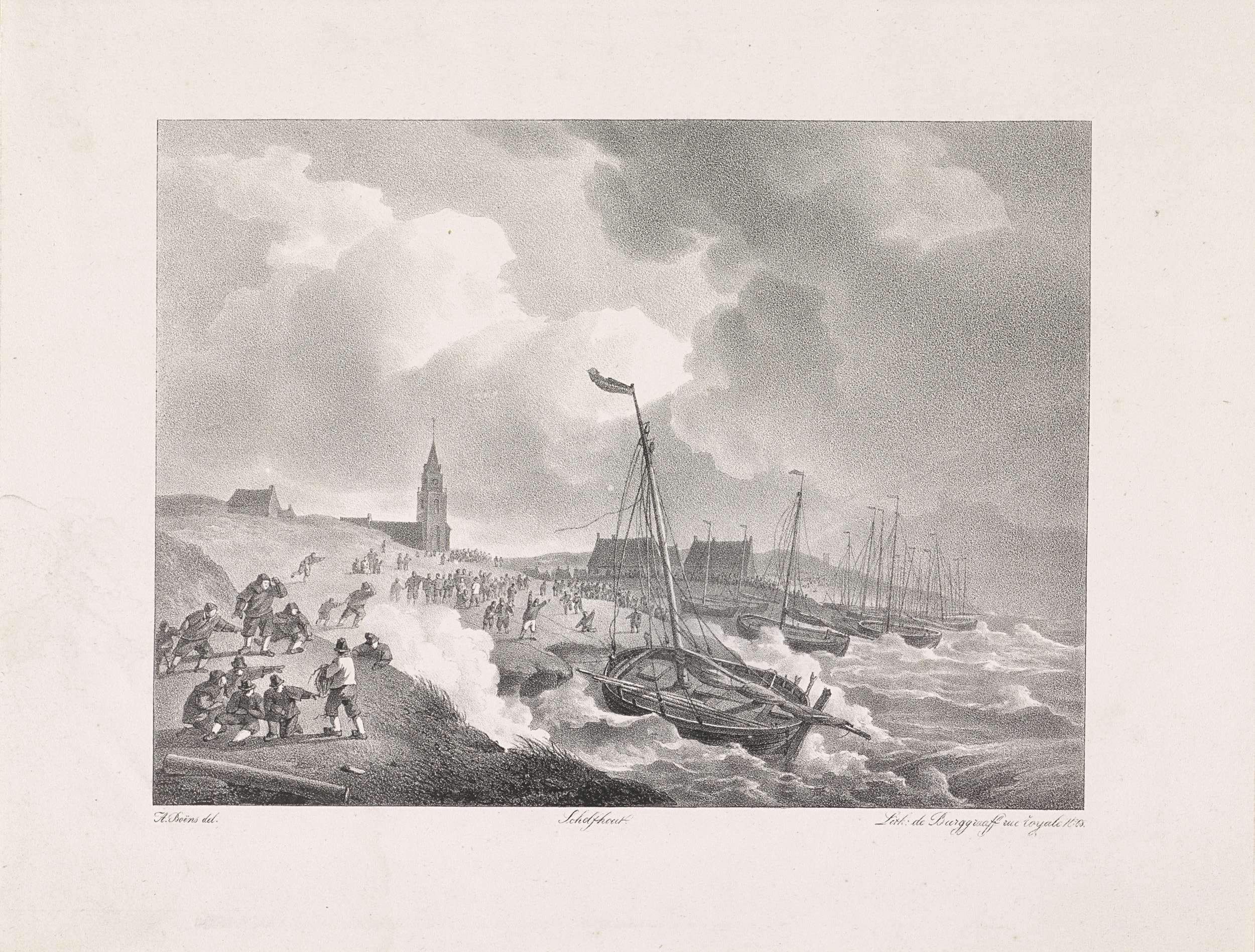 Het strand van Scheveningen tijdens de zware storm van 4 februari 1825. Inwoners van het dorp hebben zich op het strand begeven. Onderdeel van een groep illustraties uit een gedenkboek van de watersnood van 1825.