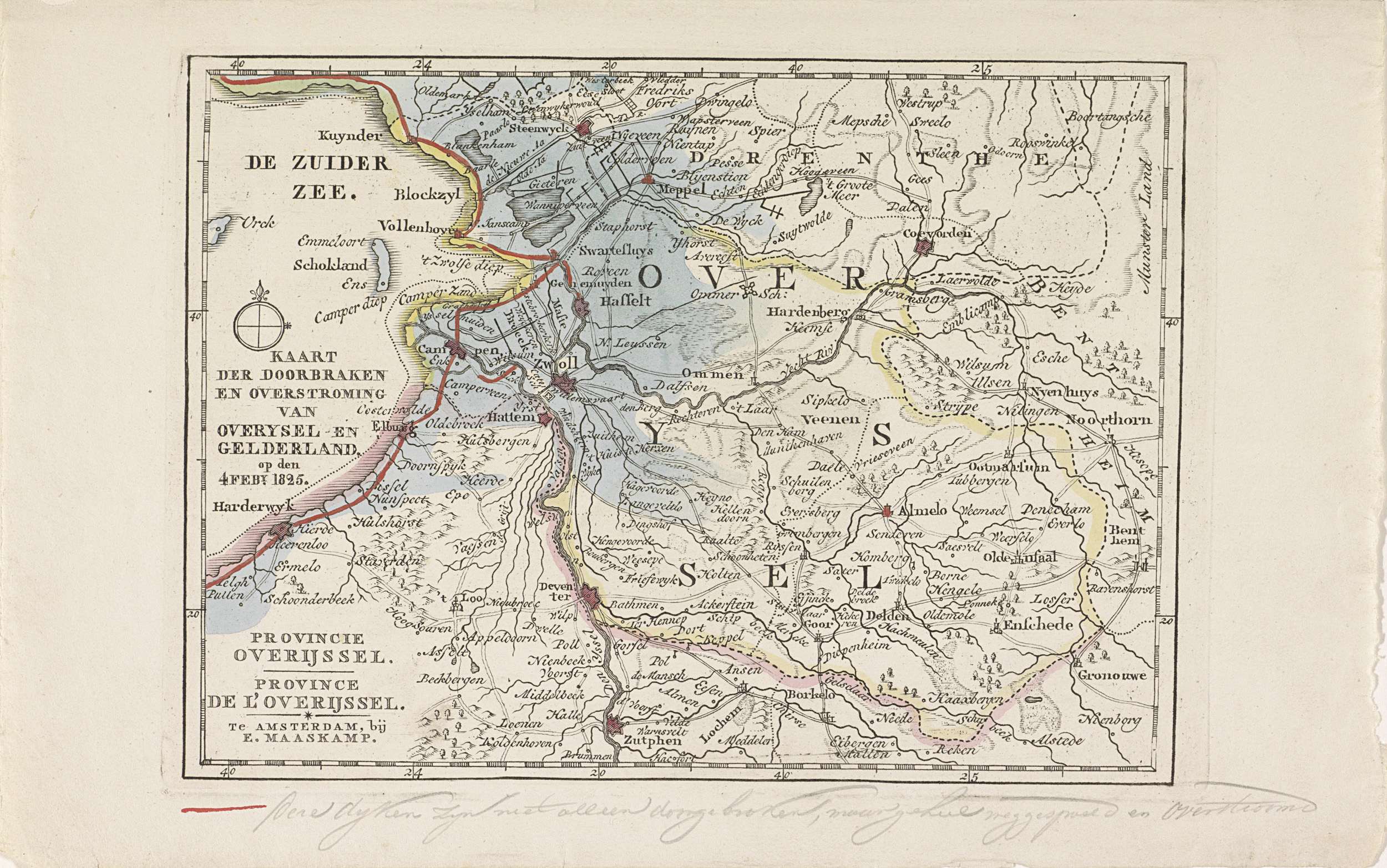 Kaart van de provincie Overijssel, waarop de gebieden in Overijssel en Gelderland getroffen door de overstromingen in februari 1825 met blauw zijn aangegeven en met rood de doorgebroken dijken zijn gemarkeerd. Onderaan het blad een regel handschrift. Onderdeel van een serie van vijf kaarten van de getroffen gebieden.