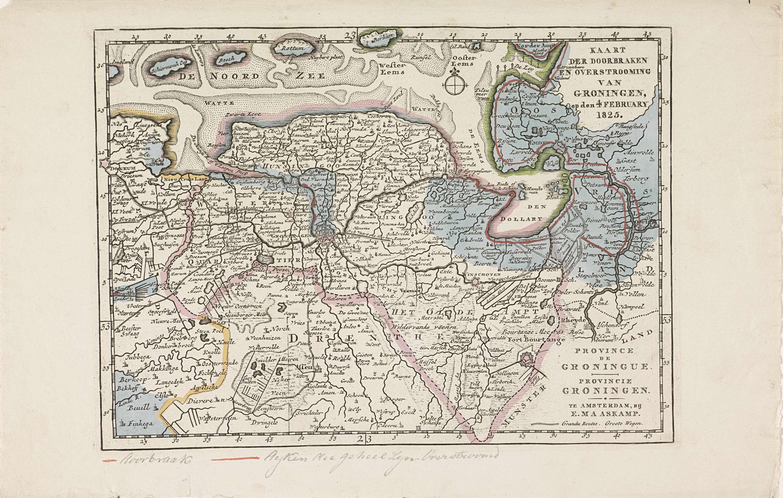 Kaart van de provincie Groningen en het Duitse Oost-Friesland, waarop in blauw zijn aangegeven de gebieden getroffen door de overstromingen in februari 1825 en met rood de plaatsen waar de dijken zijn doorgebroken. Onderaan het blad een regel handschrift. Onderdeel van een serie van vijf kaarten van de getroffen gebieden.