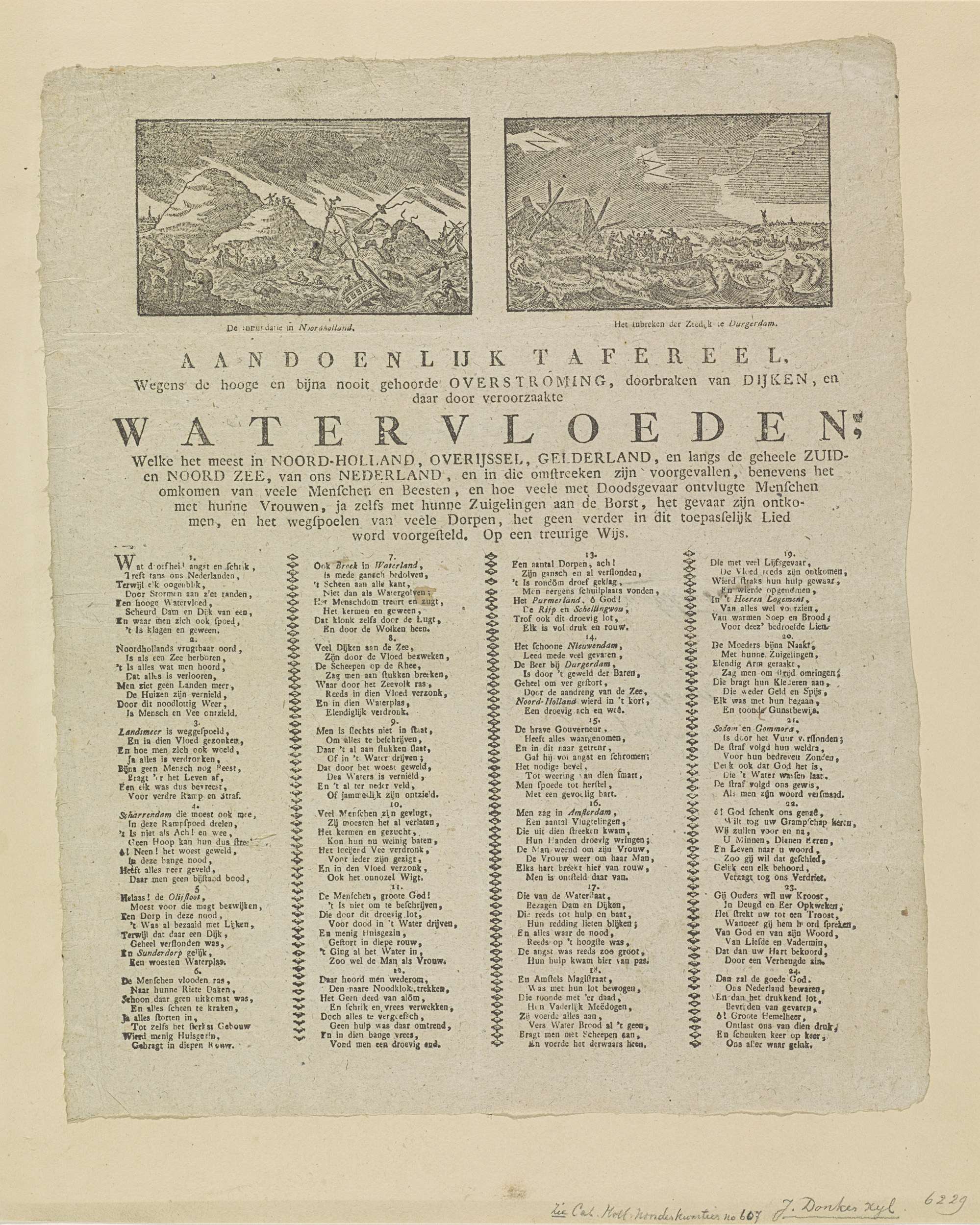 Lied in 24 coupletten op de overstromingen in februari 1825 in het noorden van Nederland, te zingen 'op een treurige Wijs'. Bovenaan twee voorstellingen van de watersnood in Noord-Holland en de dijkdoorbraak bij Durgerdam.