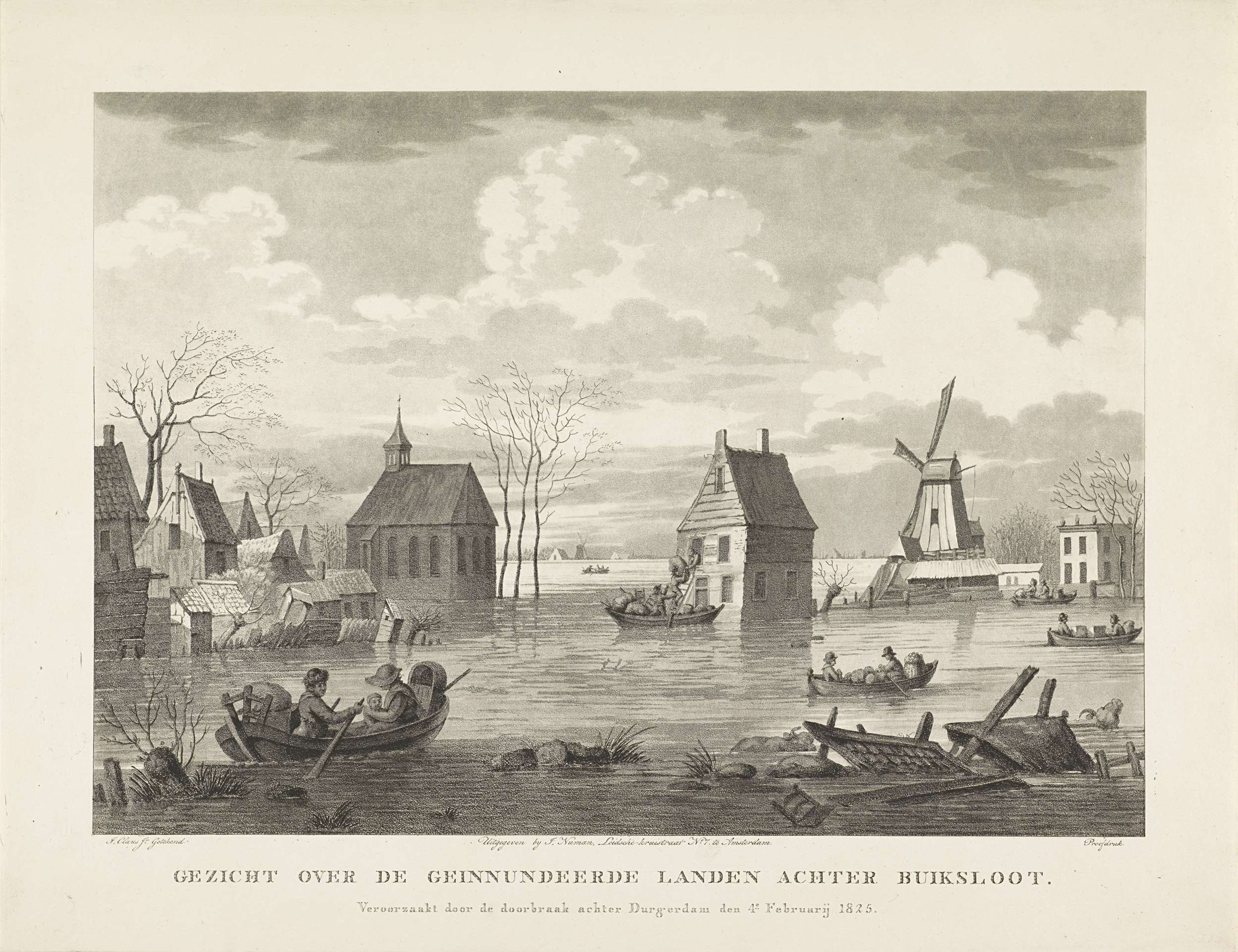 Gezicht over het ondergelopen land achter Buiksloot ten noorden van Amsterdam, als gevolg van de dijkdoorbraak bij Durgerdam, 4 februari 1825. Op het water verschillende bootjes met mensen, links een kerk, rechts een molen. Zie ook de pendant.
